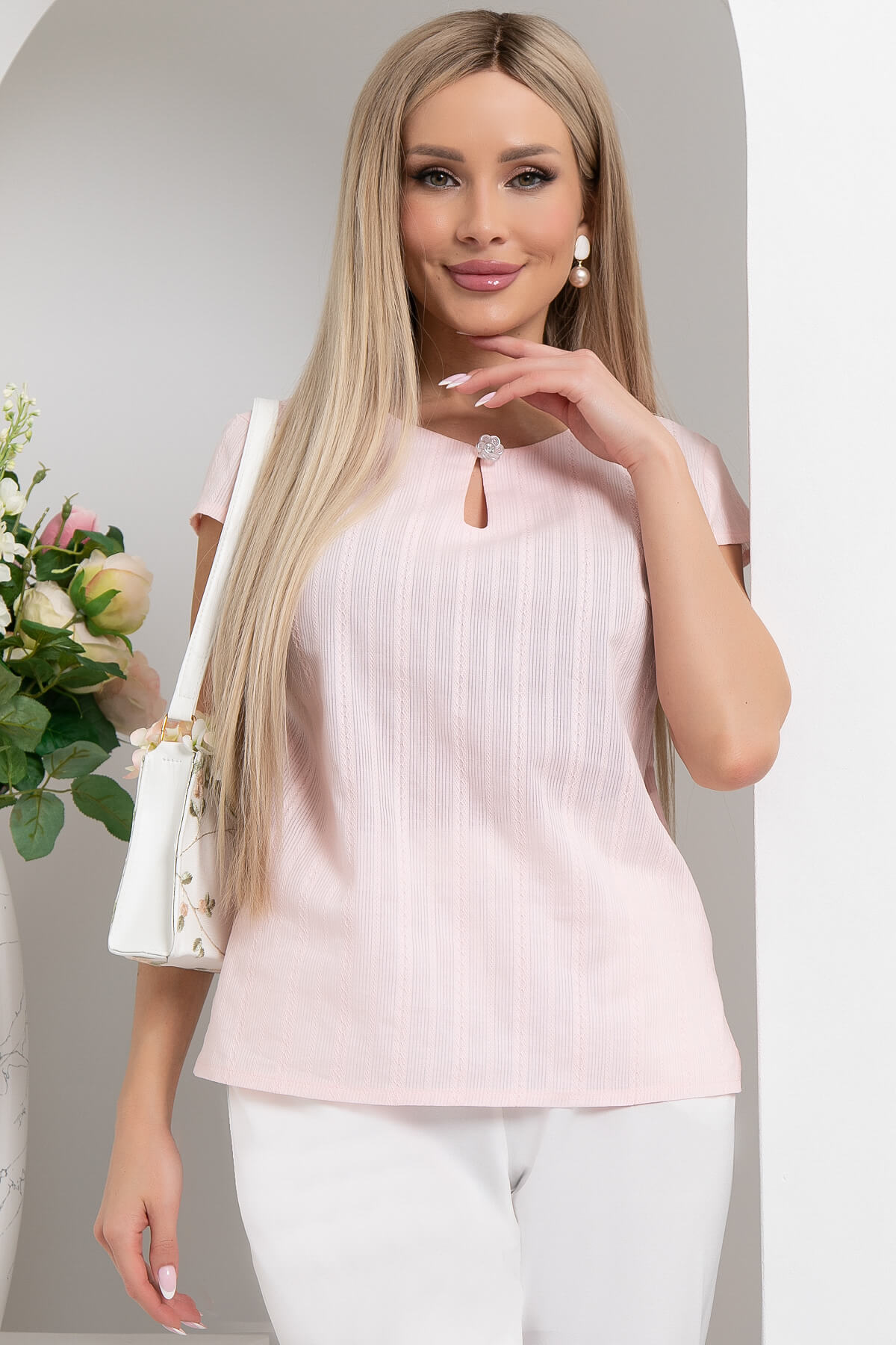 Женственная блуза в нежном розовом оттенке создаст элегантный классический образ. Блуза свободного кроя с разрезами по бокам. Округлый вырез горловины, декорирован вырезом "капелька". Рукав втачной, короткий.