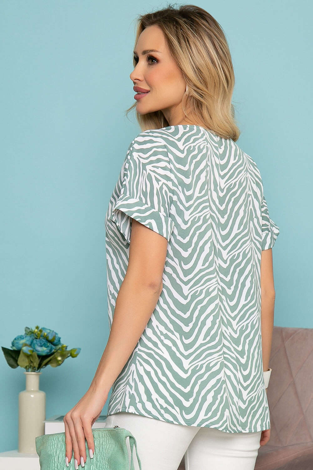 Блуза с анималистичным принтом в интересном цветовом решении. Её струящийся крой позволяет создать женственный образ. Блуза будет гармонично смотреться в сочетании как с деловым гардеробом, так и в повседневном образе, создавая романтичное настроение.