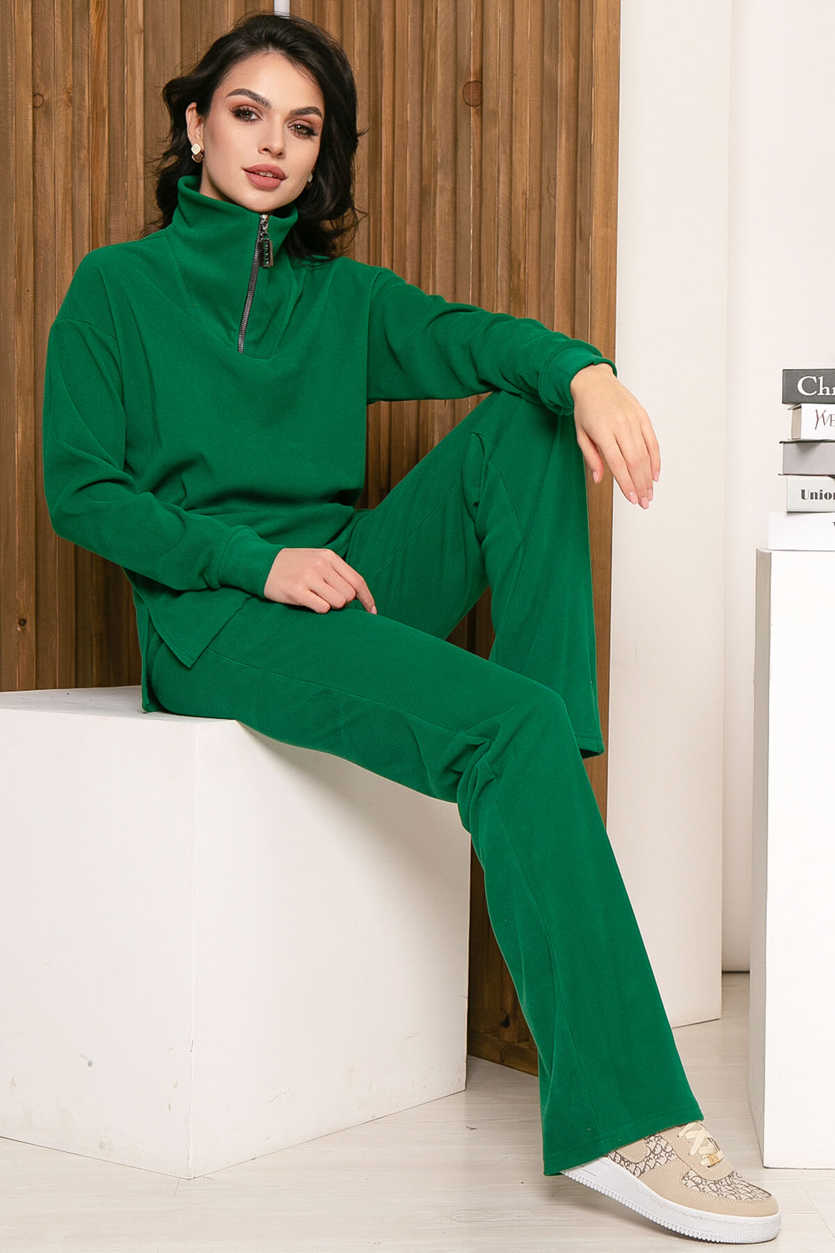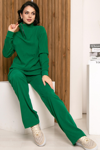 Костюм-двойка из мягкого трикотажа, состоящий из прямых брюк с высокой посадкой на резинке и джемпера прямого кроя. Джемпер имеет длинный рукав, по низу на манжете. По бокам джемпера разрезы, горловина застёгивается на молнию. Костюм прекрасно подойдёт для создания стильного и комфортного повседневного образа.