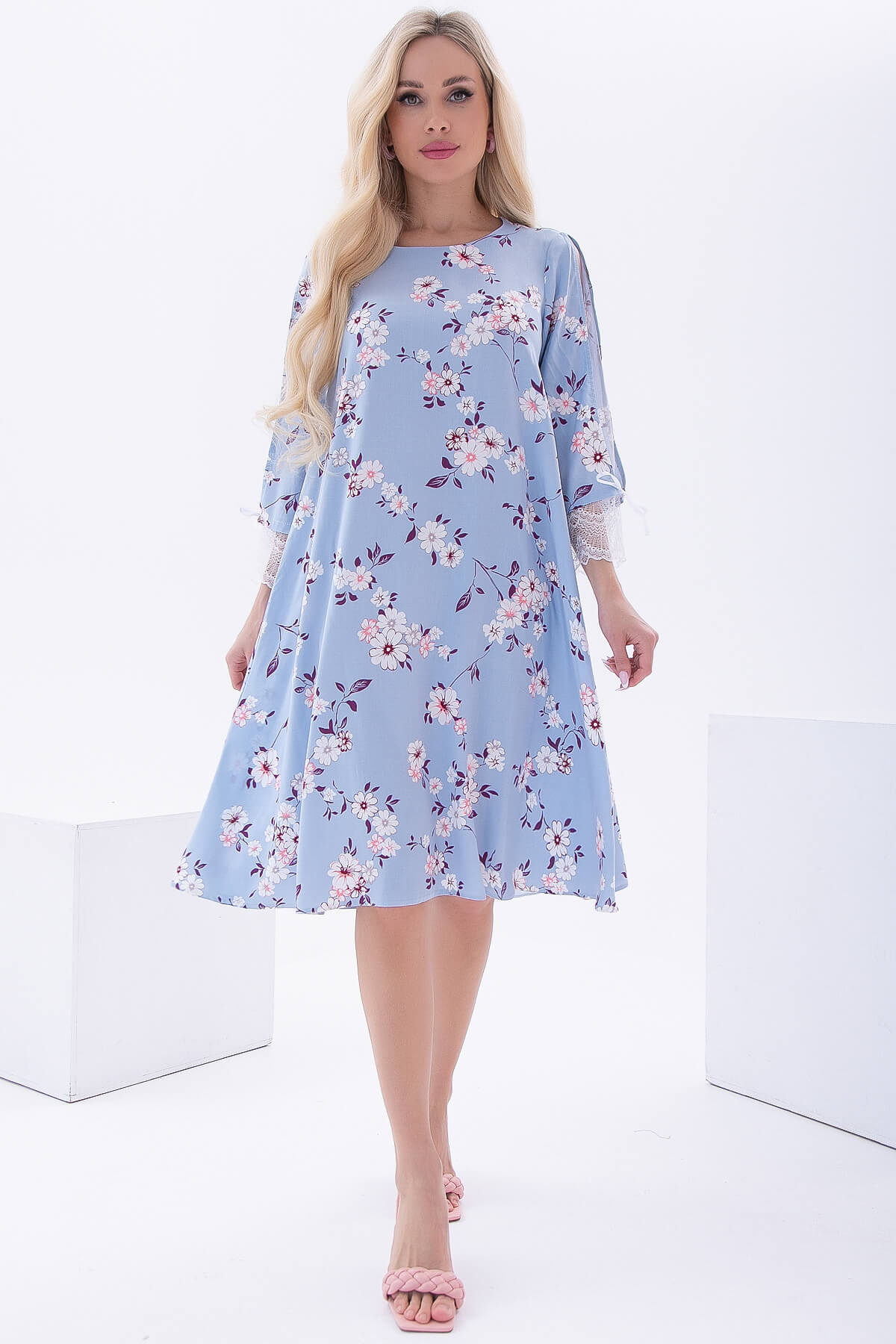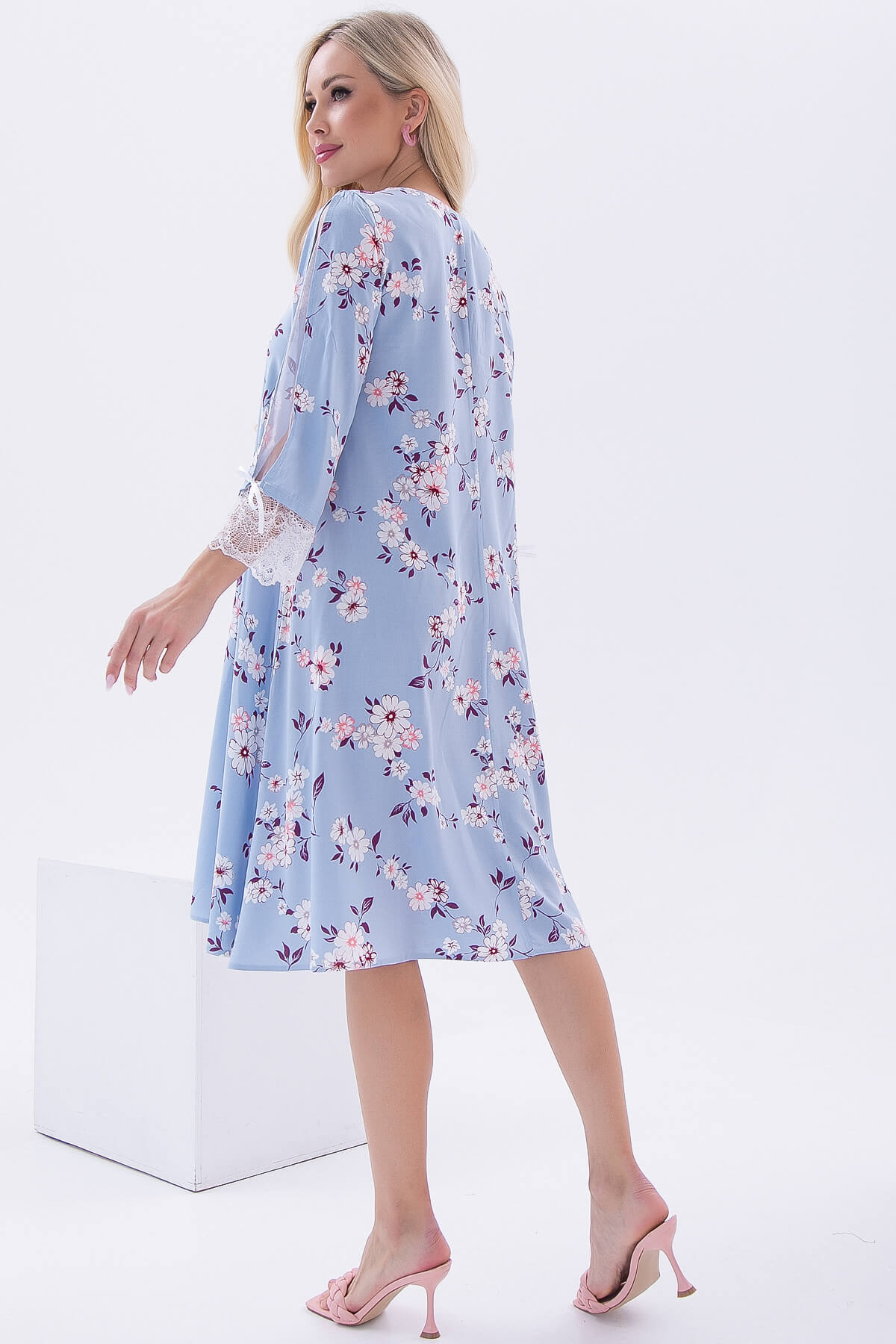 Платье, наполненное всеми атрибутами женственности. Лёгкое, струящееся платье подойдёт для любого типа фигуры за счет свободного кроя. При помощи пояса, входящего в комплект, можно подчеркнуть линию талии. Вырез горловины - округлый. Рукав втачной, три четверти, украшен сеткой с кружевом по нижнему краю и атласными лентами.