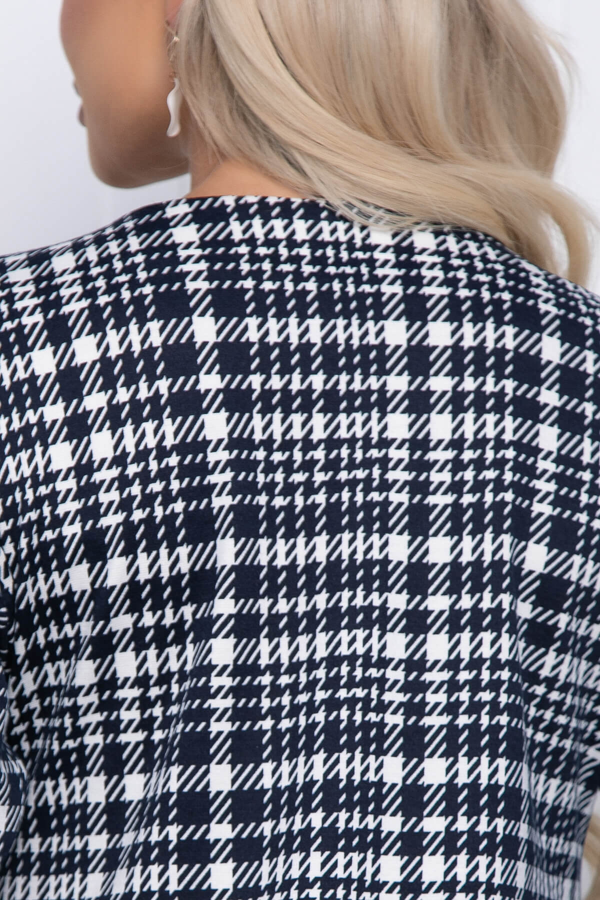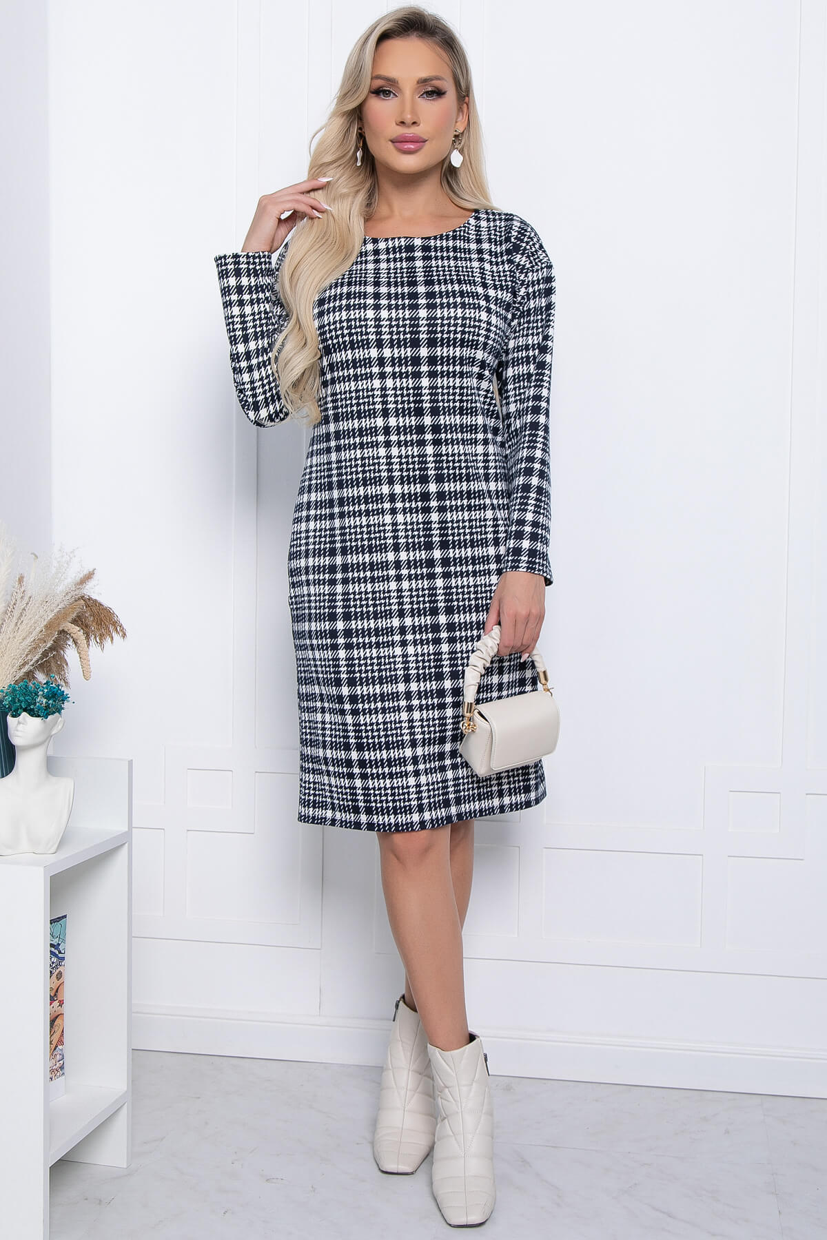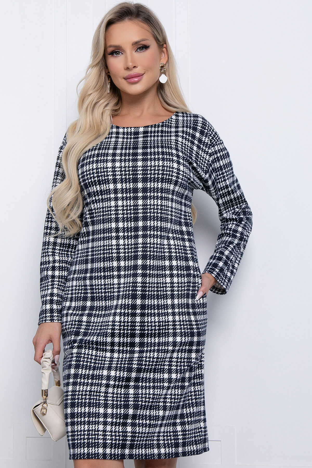 Платье со стильным принтом из трикотажа - классика повседневного образа. Такой вариант прекрасно подойдёт для офиса. Рукав семь восьмых, со спущенным плечевым швом. Горловина - округлая. Платье имеет два кармана в боковых швах.