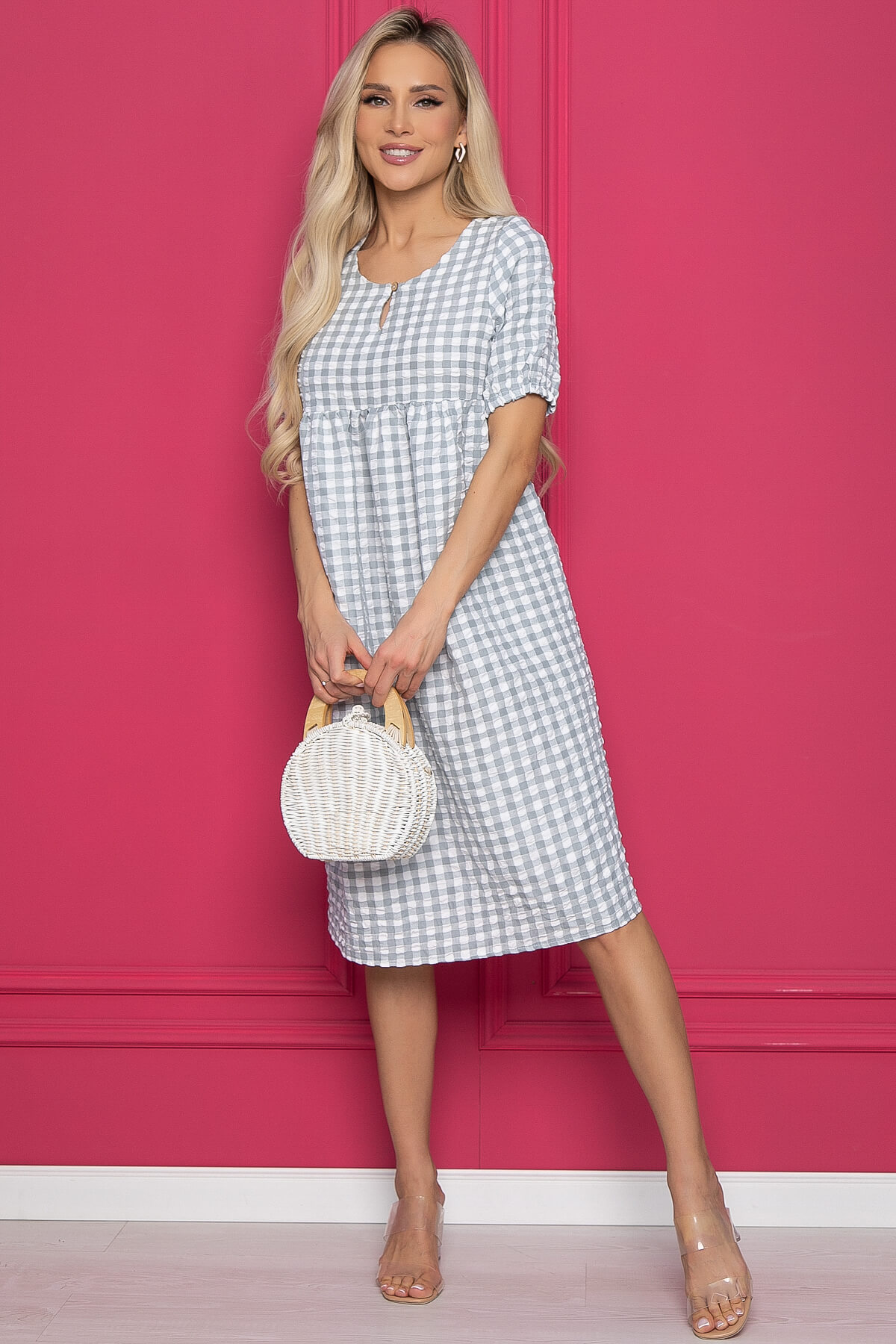 Платье с отрезной кокеткой и юбкой на сборке. Рукав короткий, пышный на резинке. По горловине спереди застежка на пуговку.