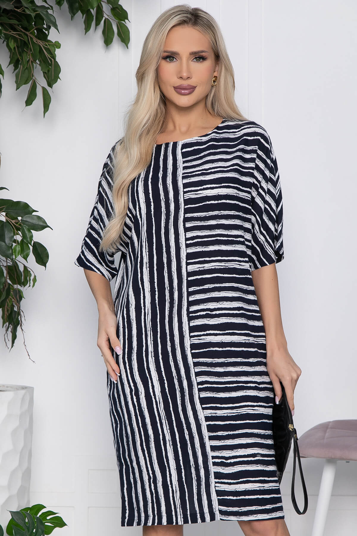 Стильное платье силуэта "бочонок", длиной выше колена, с коротким рукавом. Изюминкой данной модели является оригинальная расцветка. Элегантная модель с круглым вырезом горловины и с карманами. Прекрасный вариант повседневного платья для тех, кто стремится подчеркнуть свою женственность.