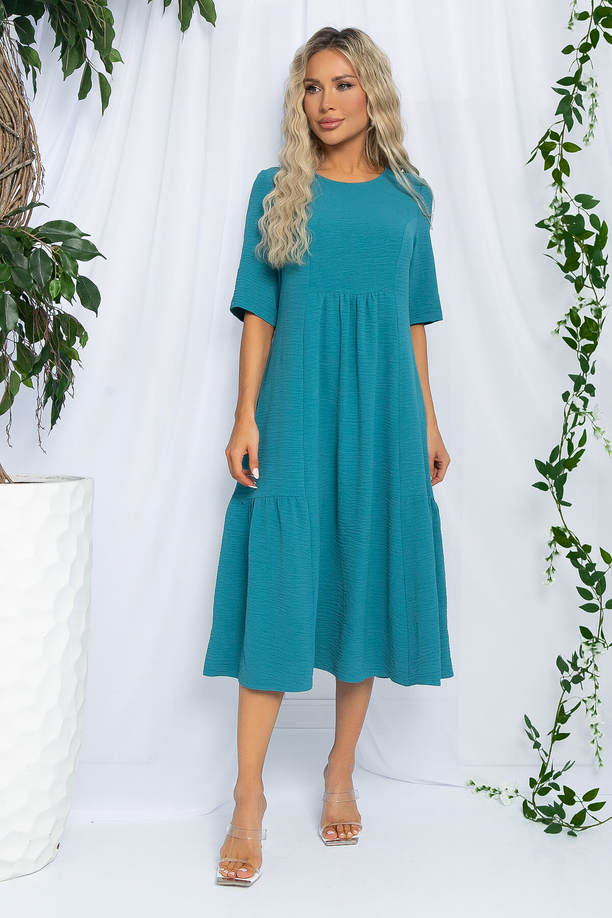 Платье свободного кроя средней длины — это прекрасный выбор для создания стильного и комфортного летнего образа! Его округлая горловина и втачные рукава средней длины придают платью изысканность. Платье расширяется к низу от линии груди, создавая нежный и воздушный силуэт. Декоративные элементы в виде сборок по бокам и чуть ниже линии груди спереди и сзади придают ему неповторимую изюминку. Это платье станет настоящим украшением вашего гардероба!