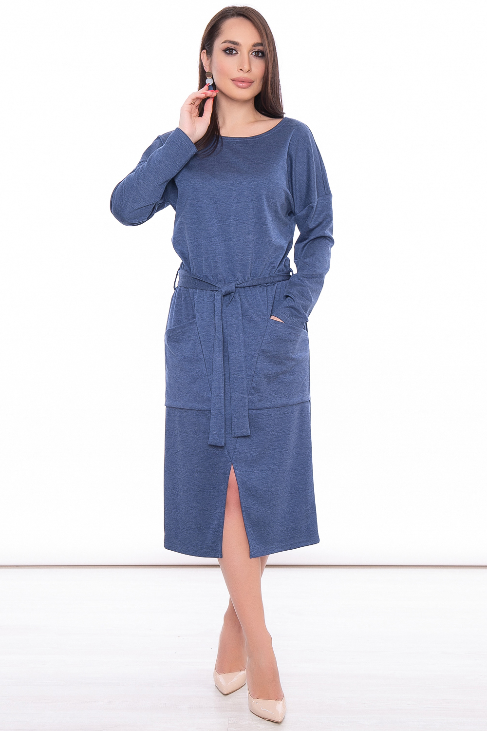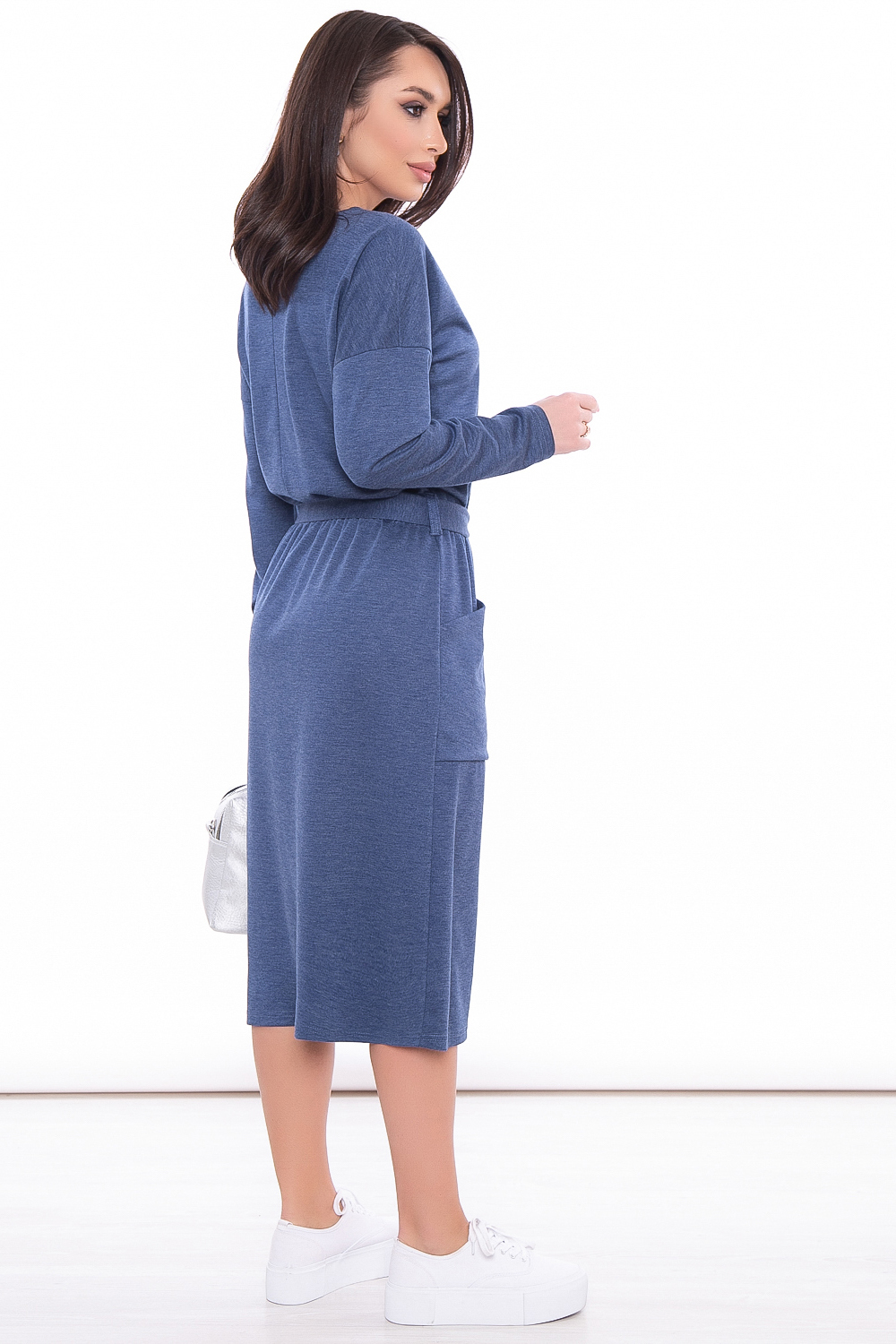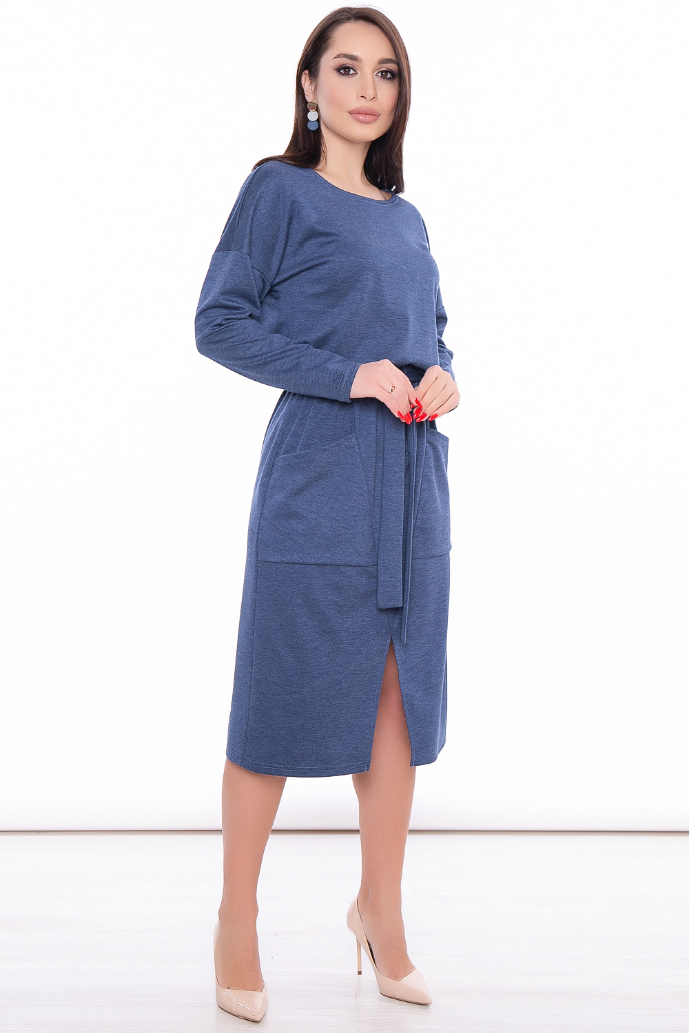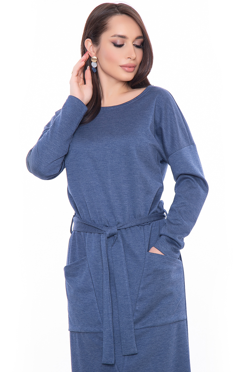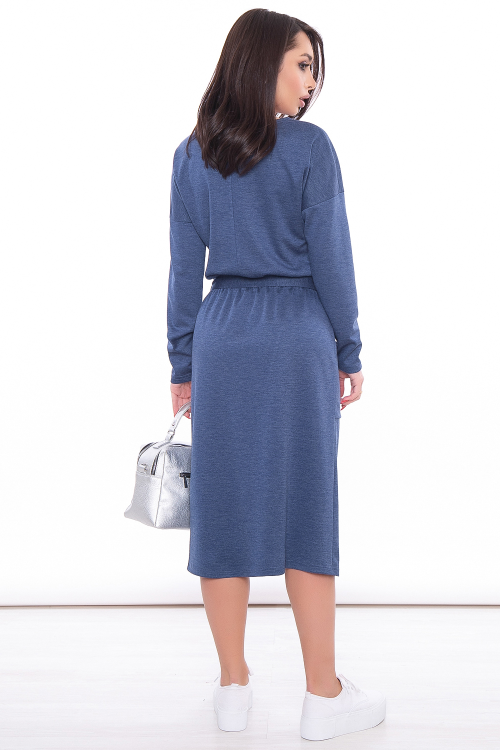 Трикотажное платье средней длины в универсальном оттенке "джинс". Если Вы искали новый необычный повседневный образ, то это платье создано, чтобы стать его частью!