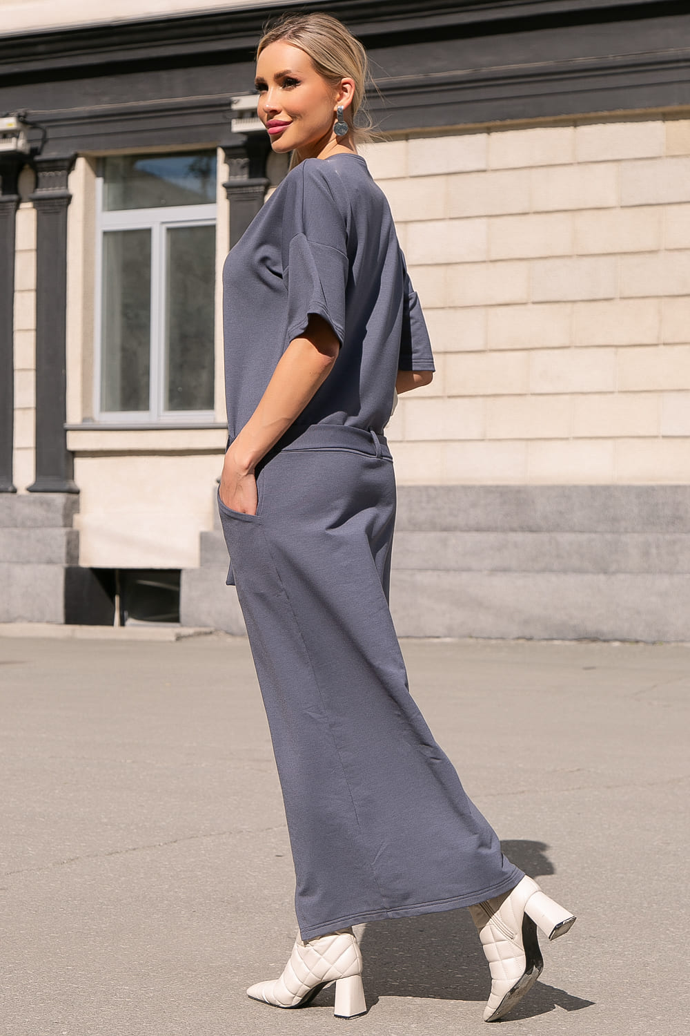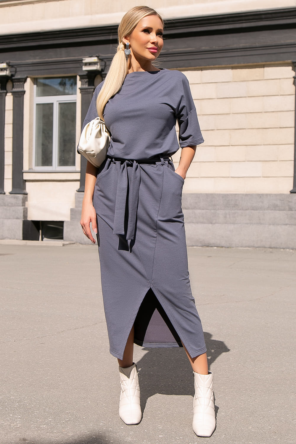 Трикотажное платье длины макси в базовом сером оттенке. Универсальное платье, которое дополнит ваш повседневный гардероб. Отлично смотрится как с туфлями на каблуке, так и с кедами или кроссовками. Платье прекрасно подойдёт женщинам в ожидании малыша, ведь его крой позволяет комфортно разместить животик. Платье прямого кроя с акцентным разрезом по переду юбки. Рукав втачной, линия плеча спущена. Платье можно завязать поясом, подчеркнув талию, или носить расслаблено в стиле оверсайз. Пояс из основной ткани входит в комплект. Платье оснащено шлёвками. Есть карманы.