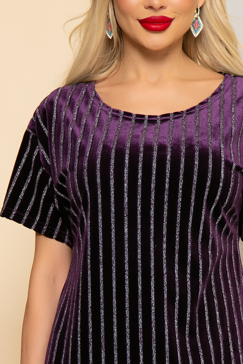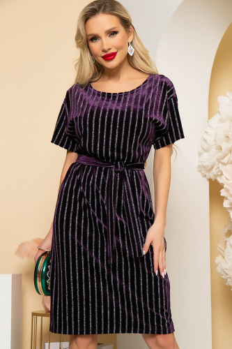 Эффектное платье полуприлегающего силуэта выполнено из мягкого велюрового полотна. Вертикальные полосы на ткани стройнят и вытягивают силуэт. Линия плеча спущена,в комплекте пояс из основной ткани, при помощи которого можно подчеркнуть талию.