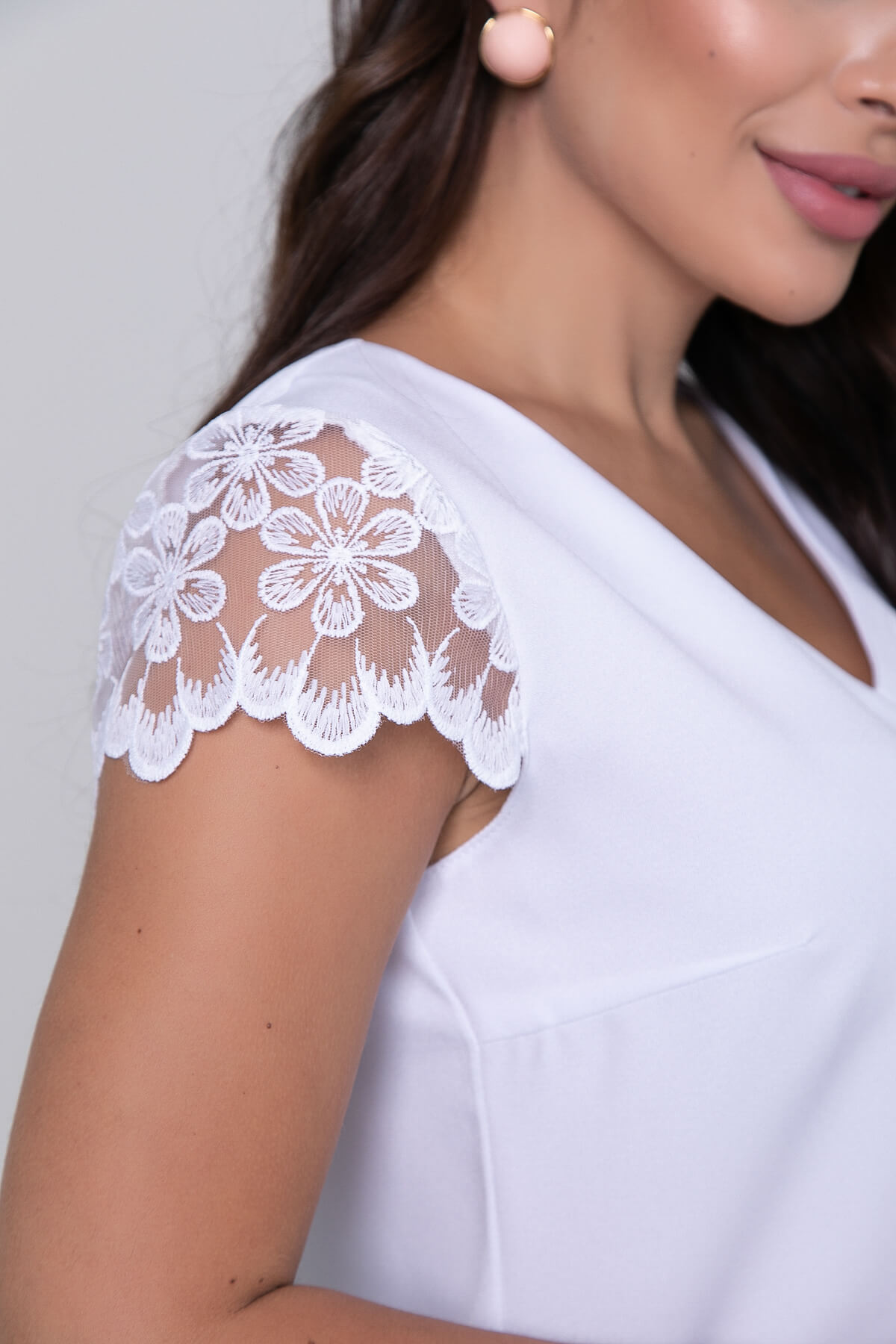 Женственная блуза в базовом оттенке создаст элегантный классический образ. Блуза свободного кроя с V-образным вырезом и рукавами с кружевом.. Рукав втачной, укороченный.