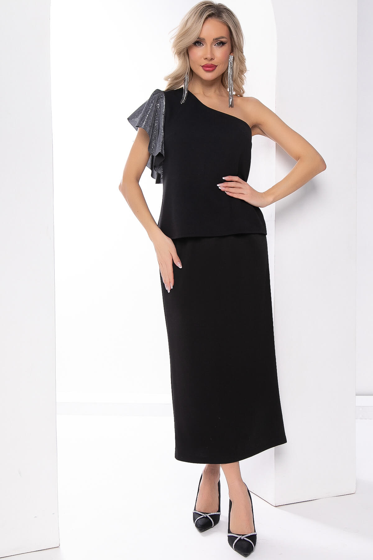 Прекрасный выбор! Черный топ на одно плечо с рукавом-воланом - стильный и элегантный элемент гардероба. Создайте невероятные образы, сочетая его с разнообразными брюками, юбками или джинсами.