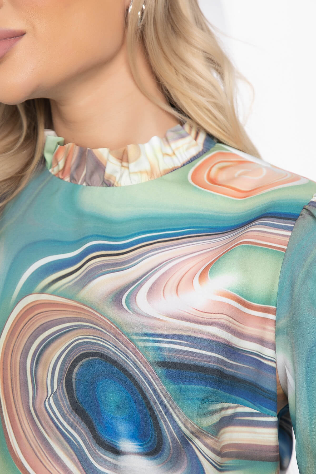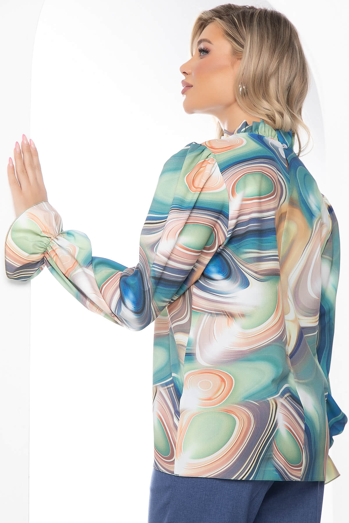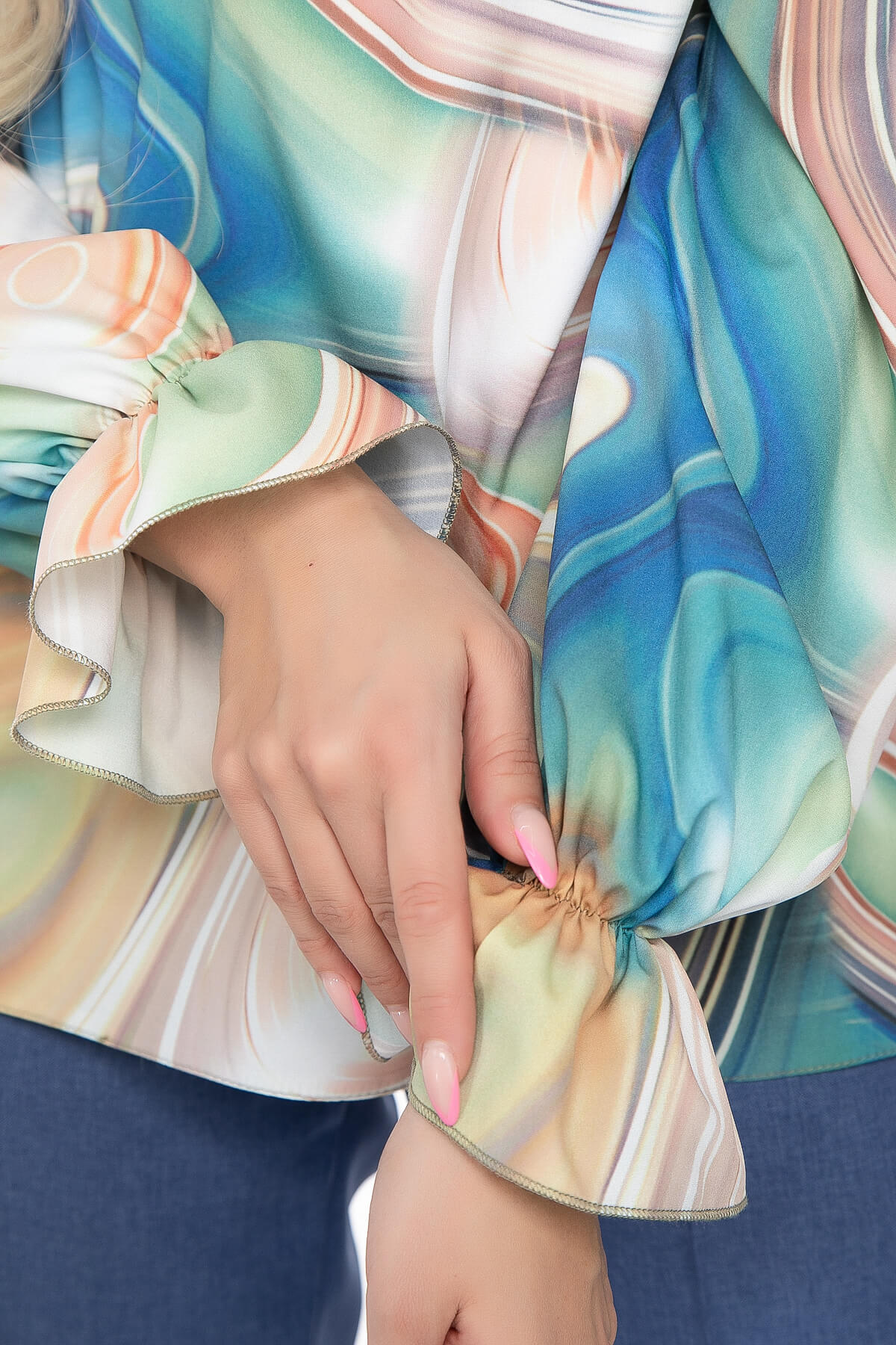 Невероятно красивая блуза свободного силуэта с нежно присборенной горловиной-стойкой. Блуза с оригинальным принтом выполнена из приятной к телу ткани. Рукав втачной, длинный, по низу рукава манжет с воланом на резинке. Такая нарядная блузка отлично подойдет для романтических встреч или других мероприятий.