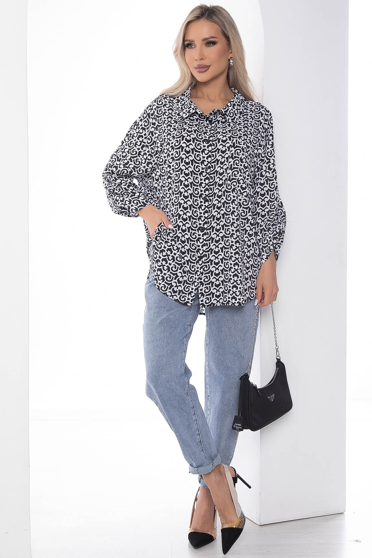 Лёгкая рубашка свободного кроя вс акцентной спинкой. Классический отложной воротник по переду, по спинке украшен цепочкой серебряного цвета. Рукав втачной, 7/8, на пате. По бокам есть разрезы. Такая рубашка подойдёт для создания стильного летнего образа и будет гармонично смотреться в сочетаниях с джинсами, шортами и брюками.