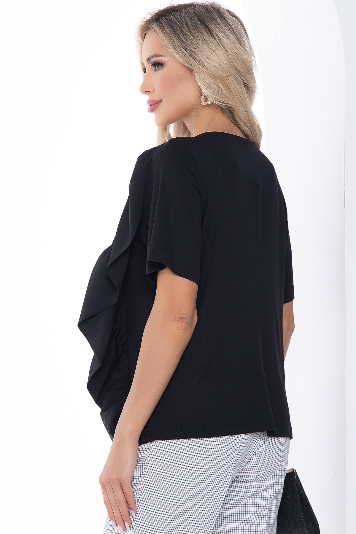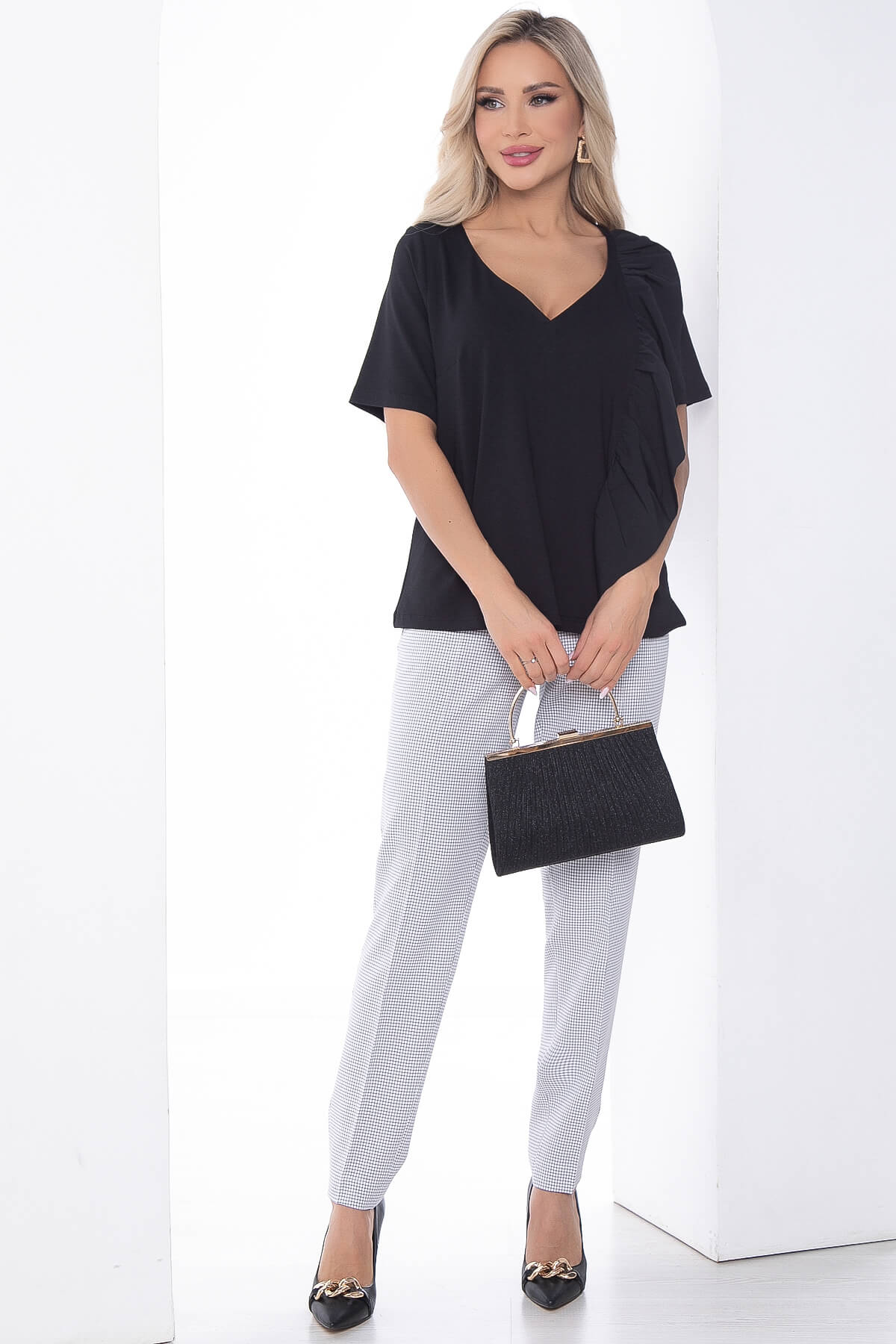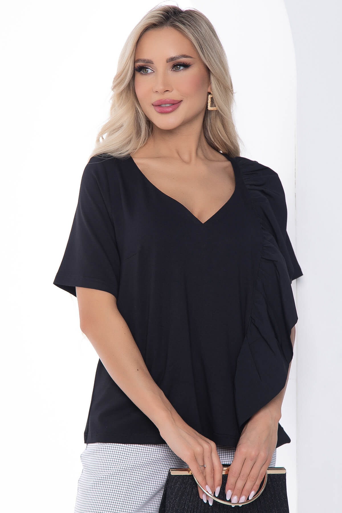 Женская блузка среднего объема с воланом по переду полуприлегающего силуэта, V-образный вырез горловины переда, короткий втачной рукав. Без подклада.