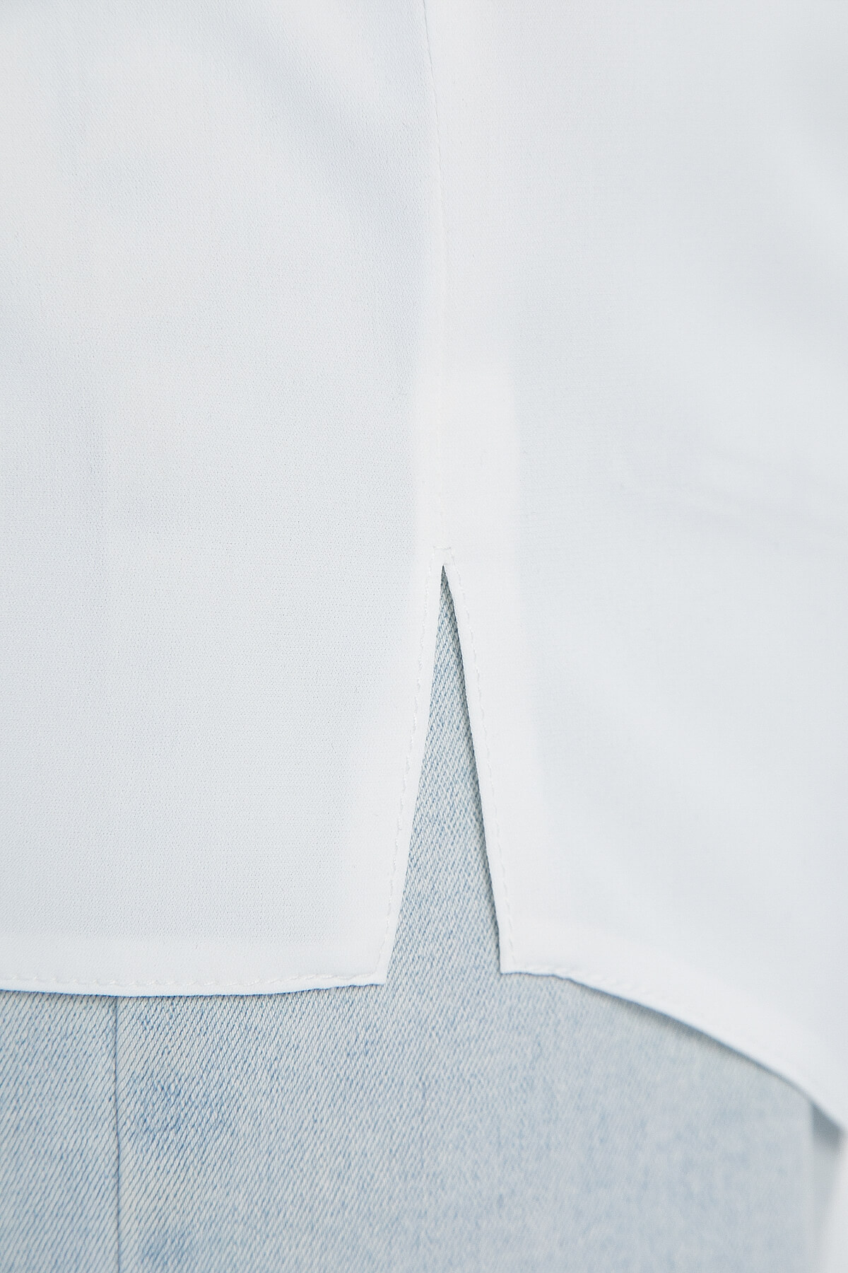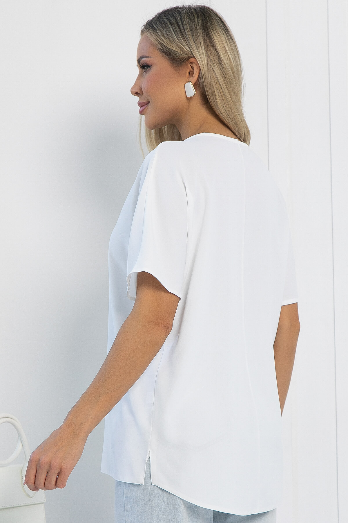 Блузка в молочном оттенке станет отличным дополнением в вашем гардеробе! Её легко сочетать с брюками, джинсами или юбкой. Также можно надеть под пиджак или жакет. Модель свободного кроя с цельнокроеным рукавом и округлым вырезом. Она подходит для повседневных образов и для домашнего использования. Благодаря своему свободному крою она обеспечит комфорт и свободу движения. По бокам разрезы. Передняя часть короче задней.