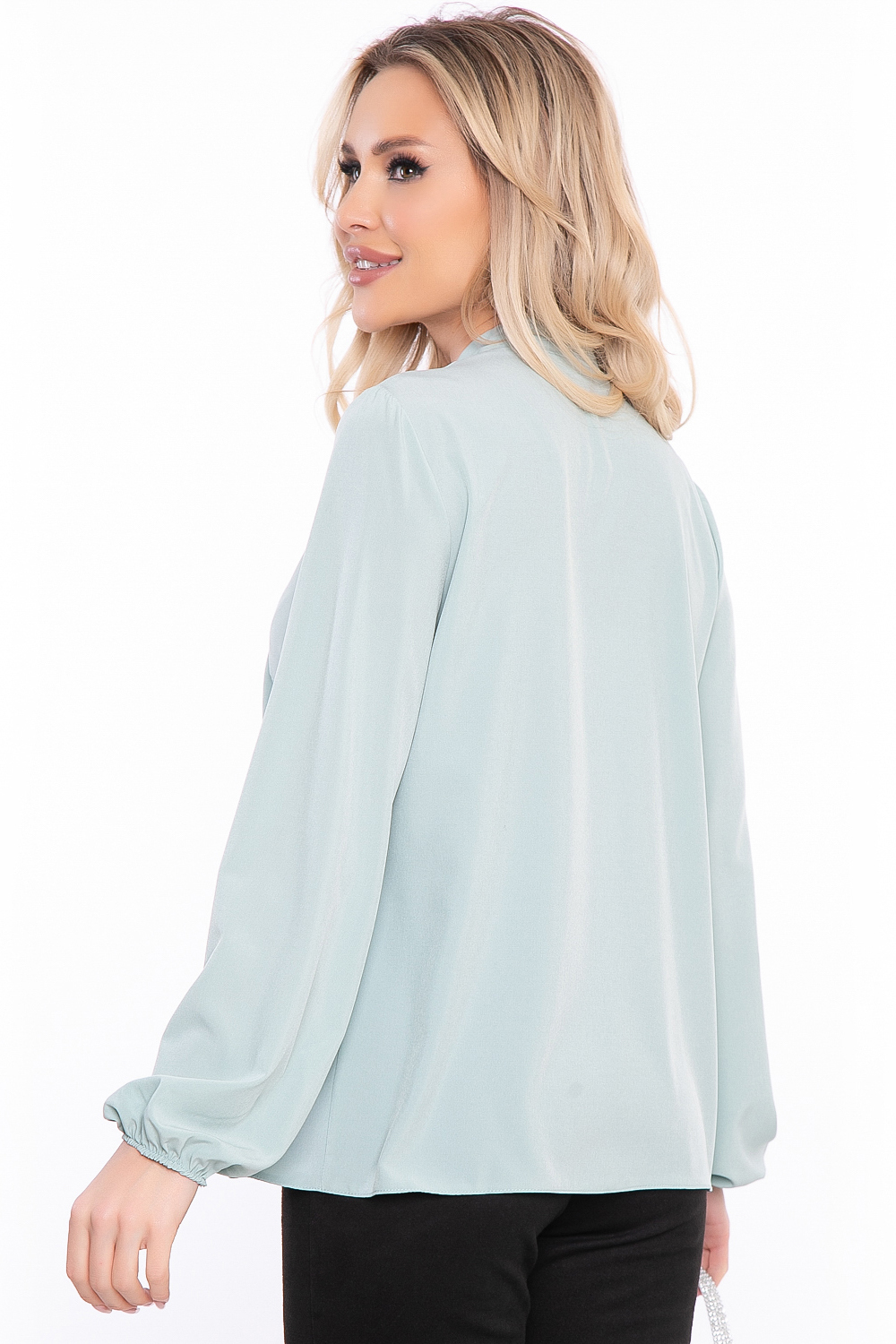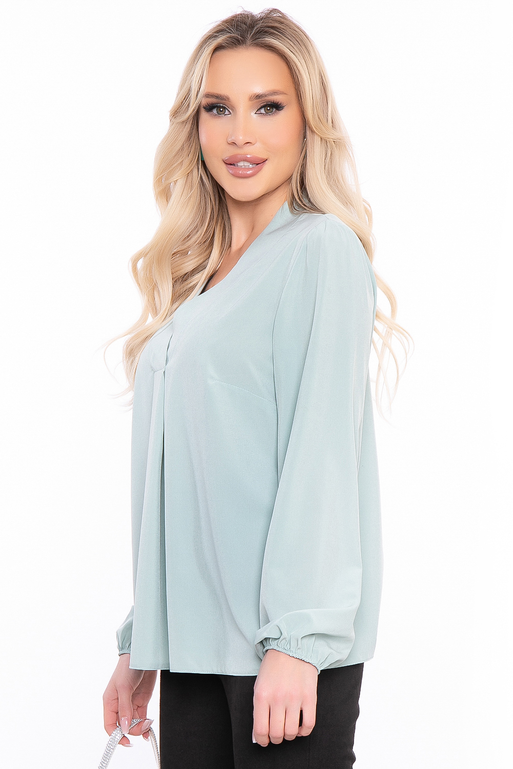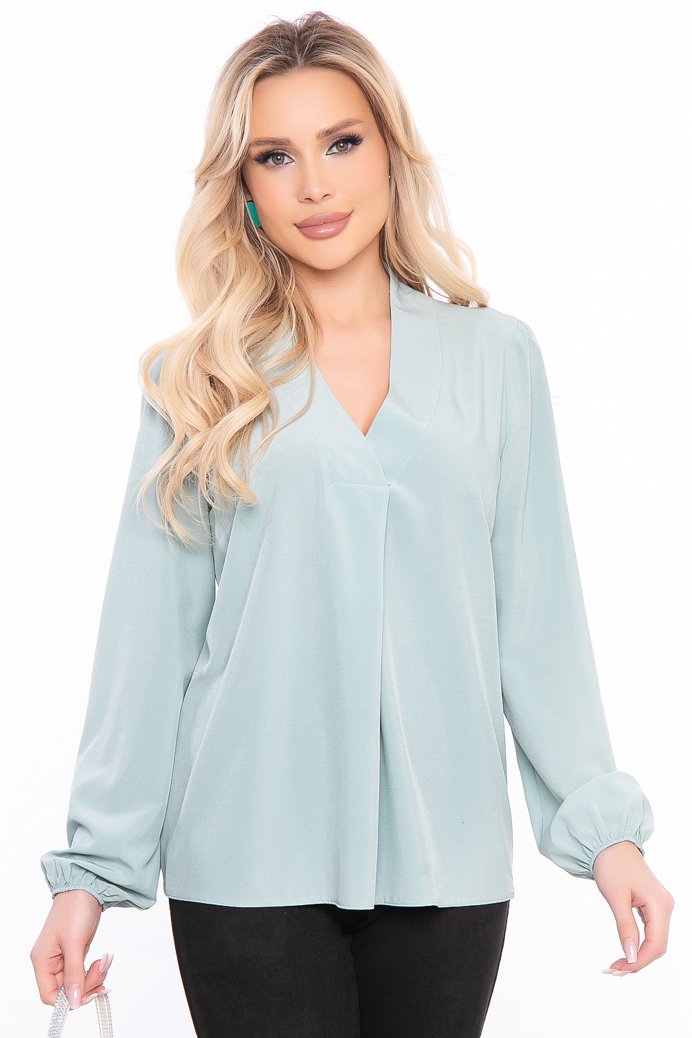 Женственная блуза в мятном оттенке классического кроя с акцентом на V-образном вырезе.