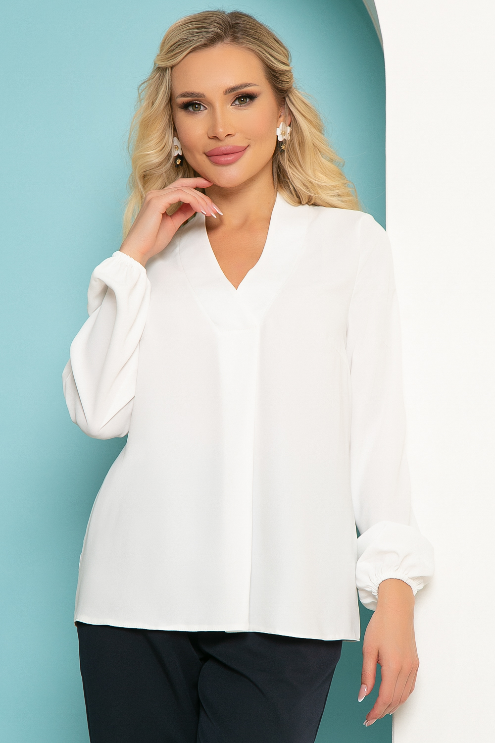 Женственная белая блуза классического кроя. Рукав втачной, длинный, низ на резинке. Мягкий V-образный вырез красиво подчеркивает зону декольте. По переду планка.