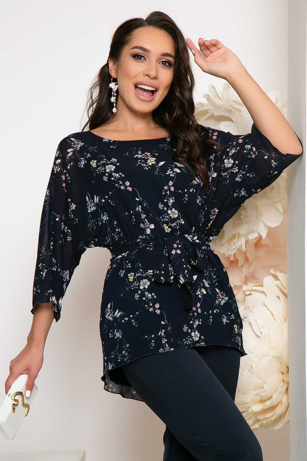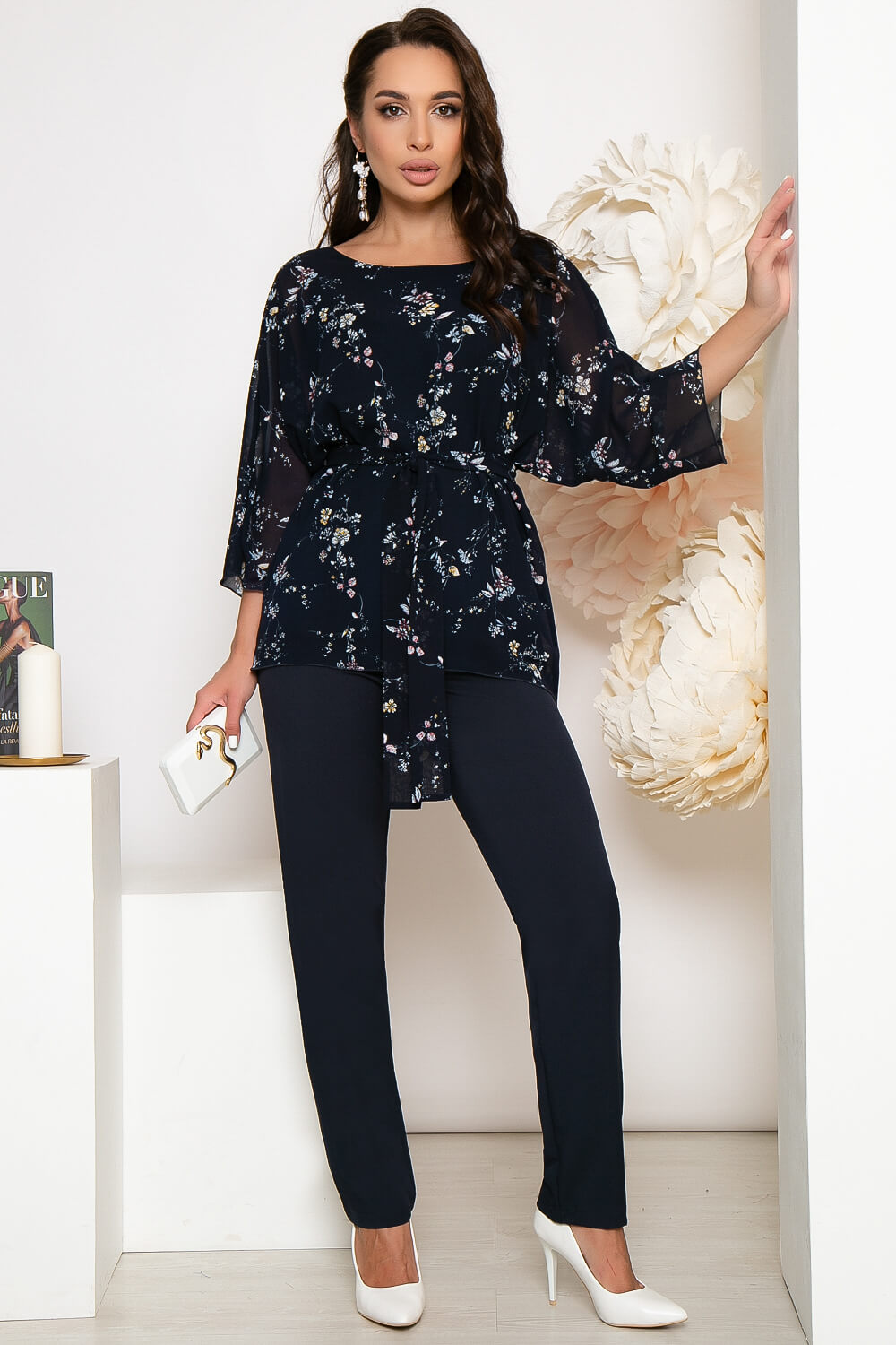 Невероятно женственный костюм-двойка, состоящий из прямых брюк на резинке и блузы свободного кроя. Блуза на подкладке, спинка удлинена. Имеет мягкий, округлый вырез горловины, цельнокроенный рукав три четверти. В комплект входит пояс из основной ткани.
