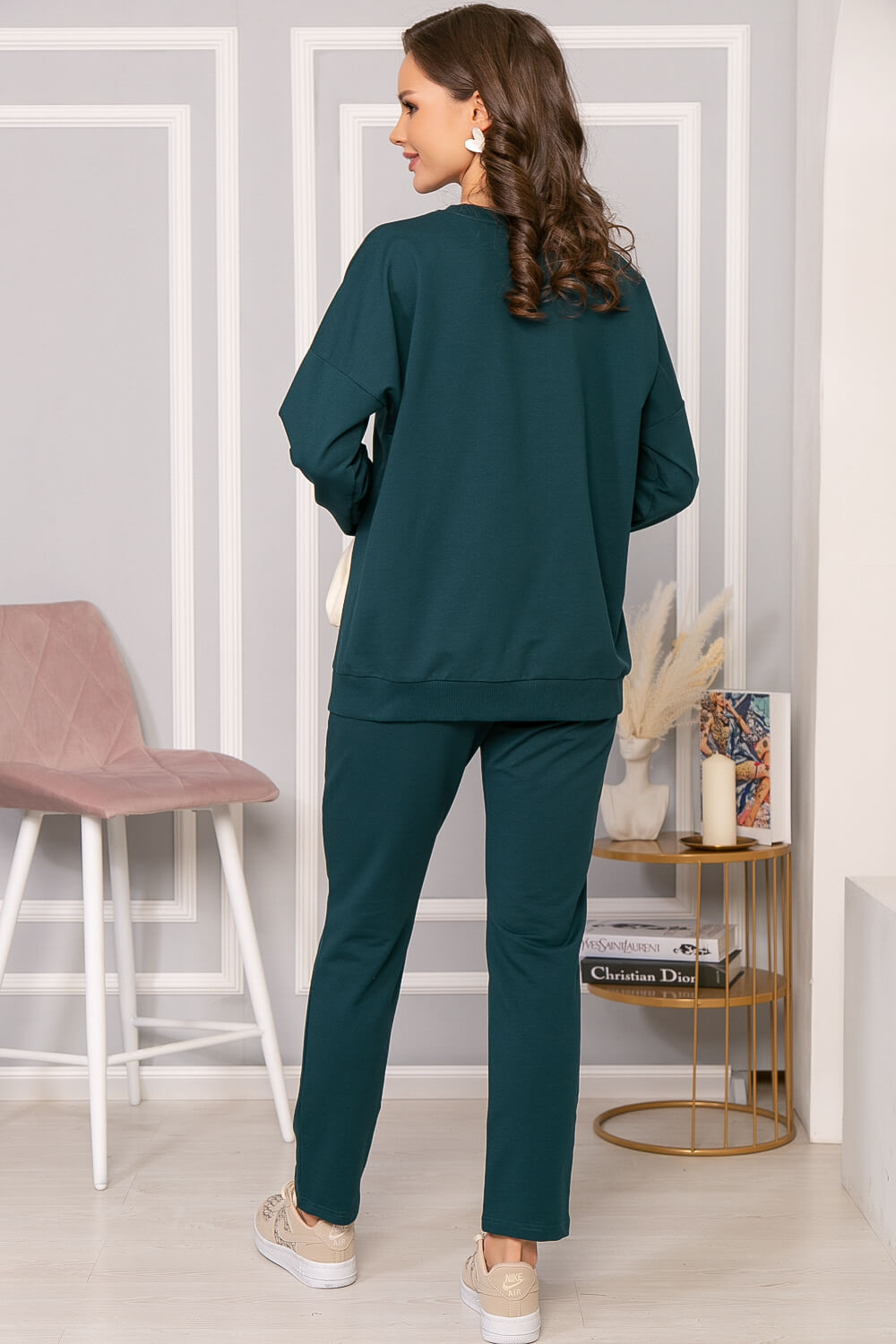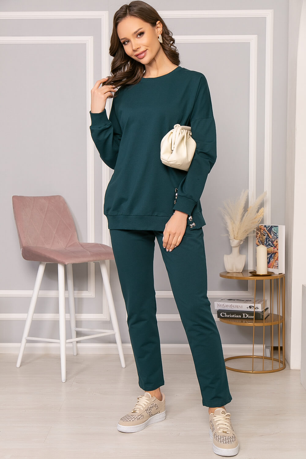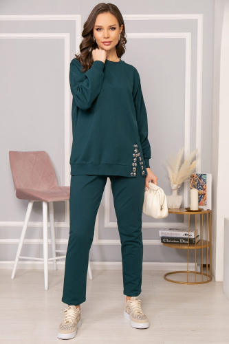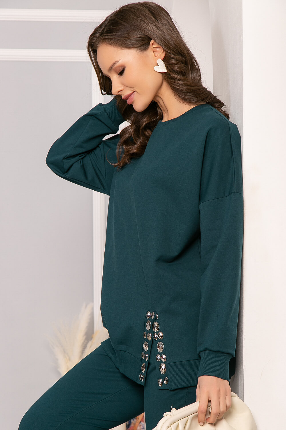 Костюм-двойка, состоящий из брюк и свитшота. Брюки по талии на резинке, слегка заужены книзу. Свитшот украшен декоративным разрезом. Камни пришивные, имеют много граней. Рукав длинный, втачной, на манжете. Линия плеча спущена.