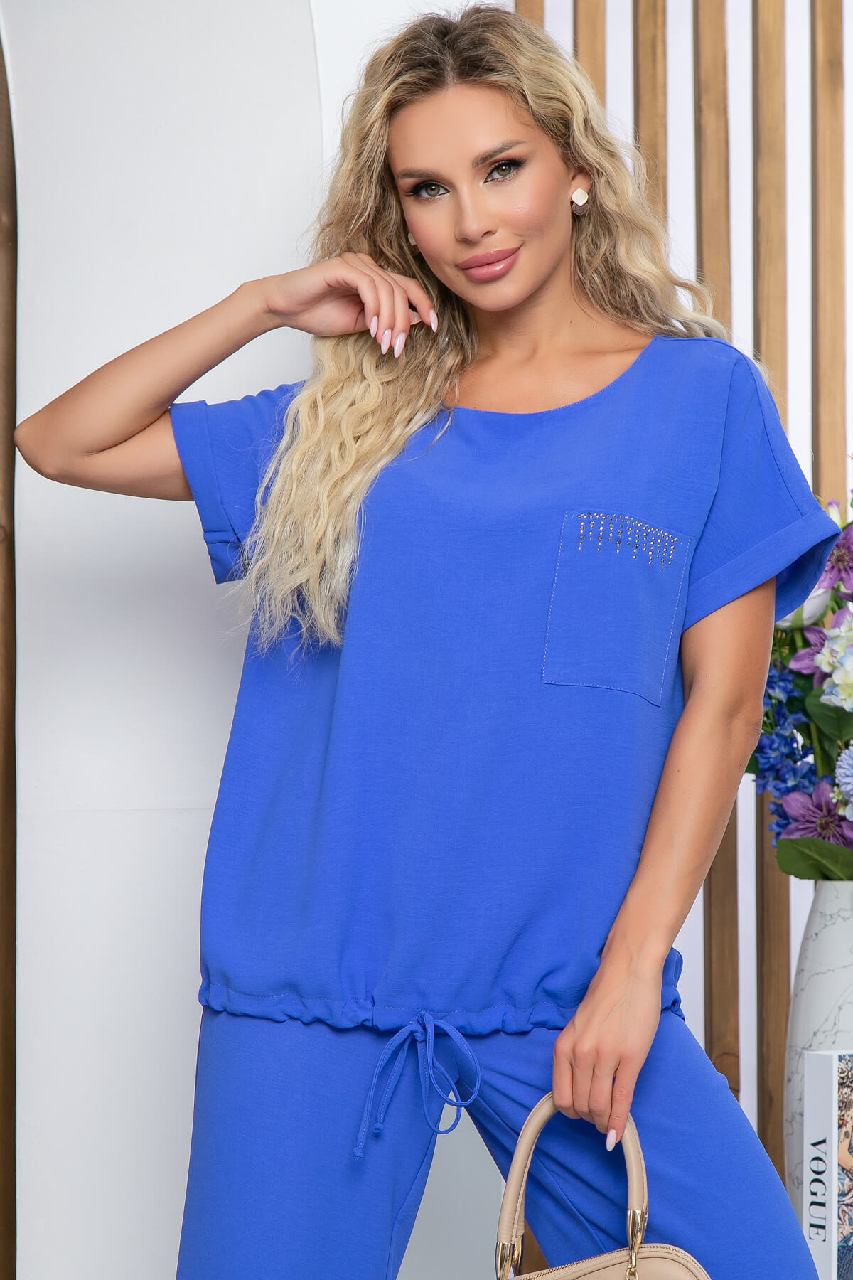 Блуза: свободный крой, цельнокроеный рукав, округлый вырез горловины, по передней части низа на кулиске.