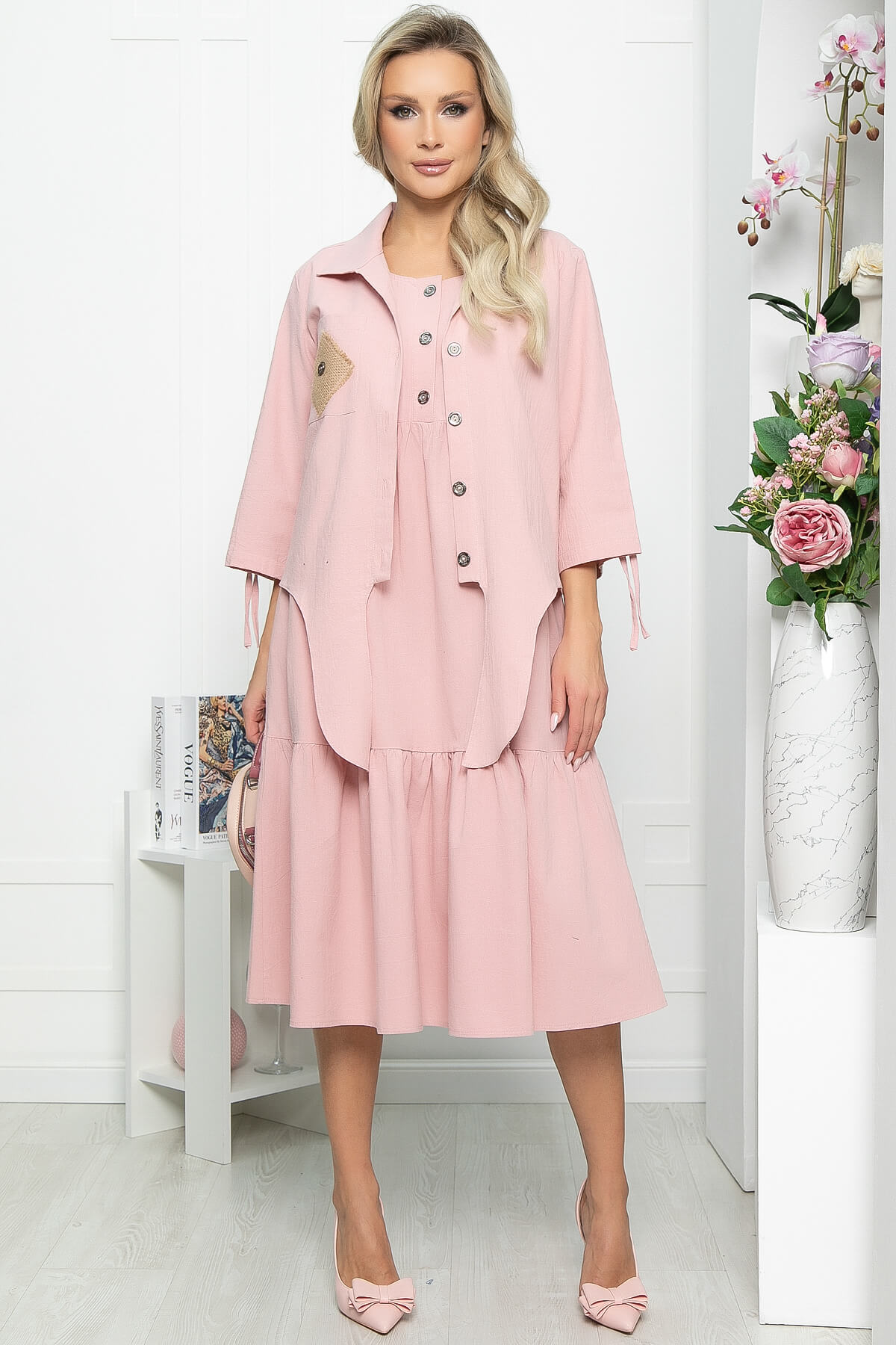 Костюм двойка состоит из платья и блузы. Отлично будет гармонировать в повседневной жизни. Платье имеет завышенную талию, это позволит скрыть недостатки фигуры. Изюминку придает так же широкий волан по низу.