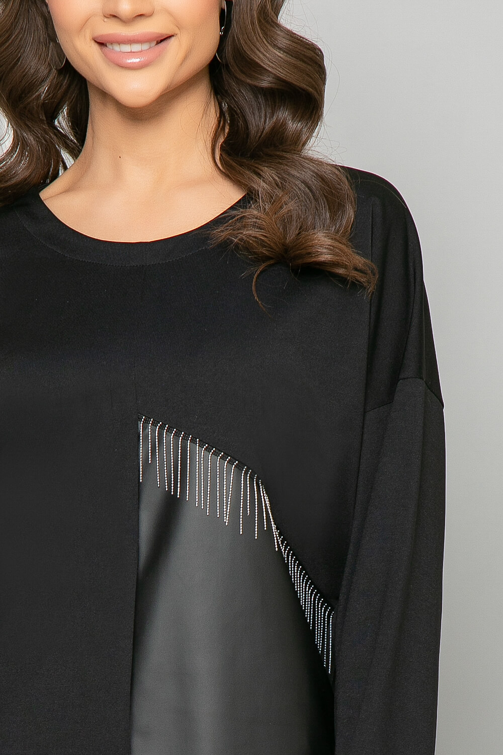 Создайте идеальный образ "Total black" с новым костюмом из комбинированных материалов. Брюки удобного кроя по талии оснащены резинкой. Свитшот свободного кроя по переду украшен металлическими цепочками. Такой костюм прекрасно подойдёт для создания повседневного образа.