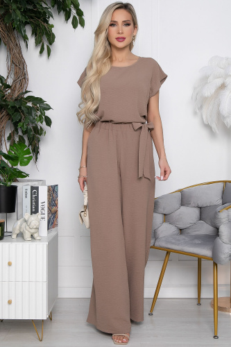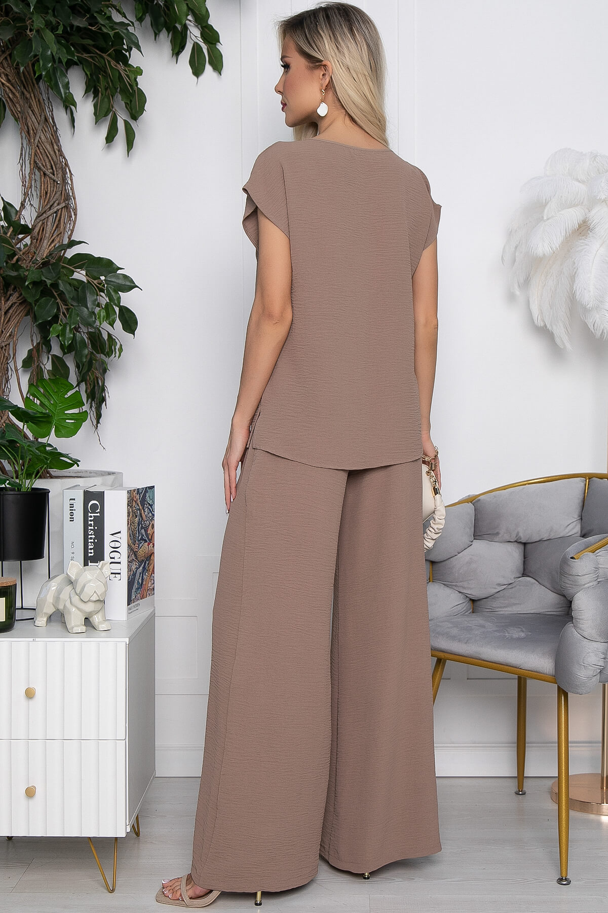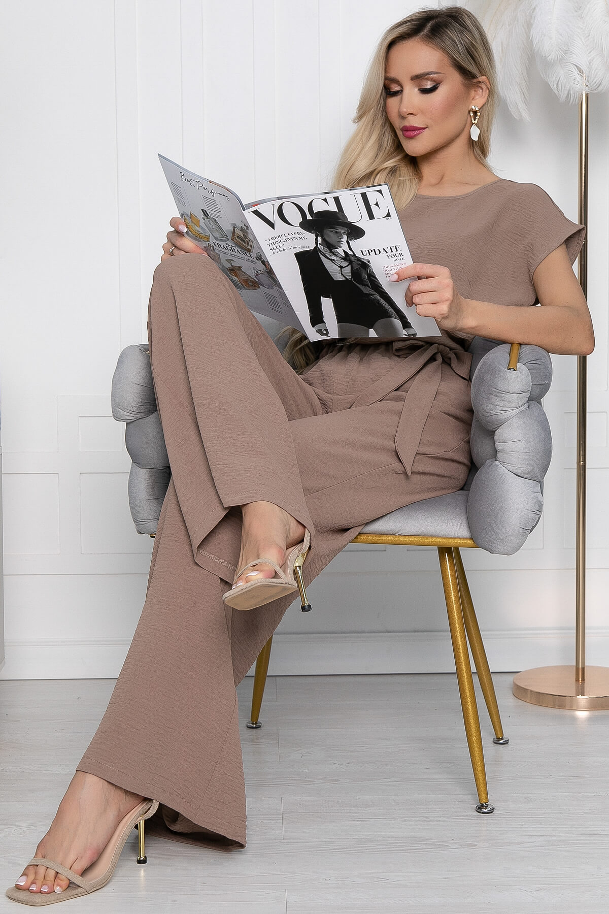 Костюм из лёгкой ткани отлично походит как для повседневной жизни, так и для праздничного мероприятия. Для более праздничного образа можно добавить украшения. На брюках есть вшитый пояс, благодаря которому можно регулировать ширину талии. Блуза с коротким и цельнокроеным рукавом.