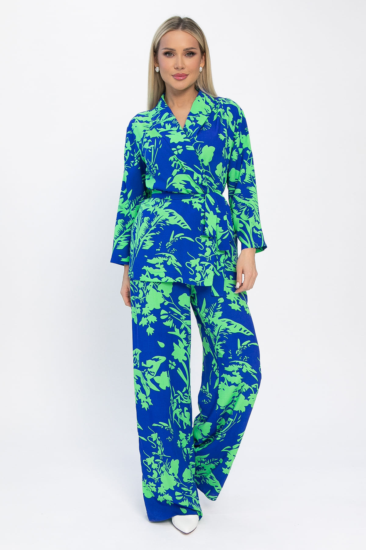 Костюм из лёгкой ткани идеально подойдёт для летнего расслабленного образа. Свободный крой не сковывает движений и дарит комфорт. Рукав три четверти, со спущенным плечевым швом. В комплект входит пояс из основной ткани, который позволит подчеркнуть преимущества фигуры.