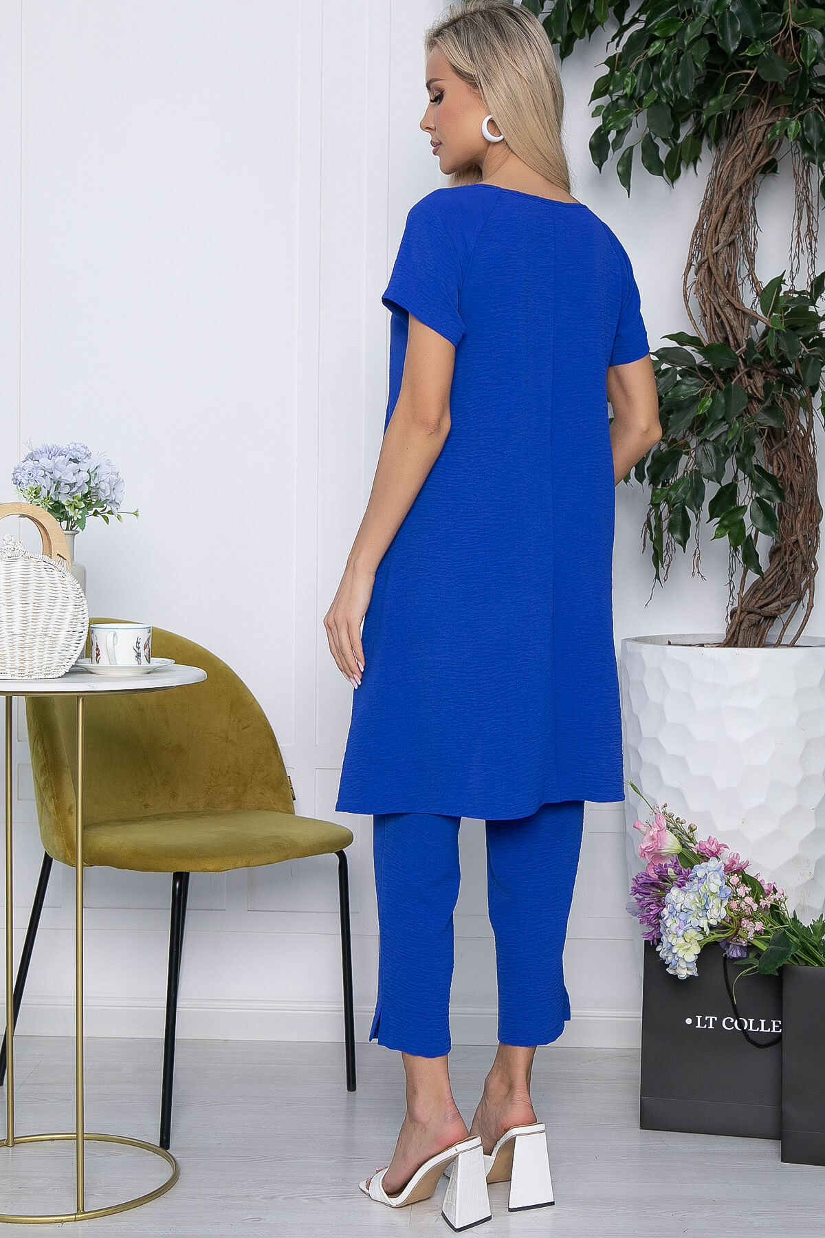С этим комплектом вы будете ощущать себя комфортно, независимо от того, где вы находитесь. Необычный фасон придаст свежести вашему летнему гардеробу. Костюм состоит из туники и укороченных брюк! Брюки заужены к низу, по бокам снизу разрезы, карманы в боковых швах, талия на резинке. Туника А-силуэта с асимметричным низом, рукав кроя "реглан".