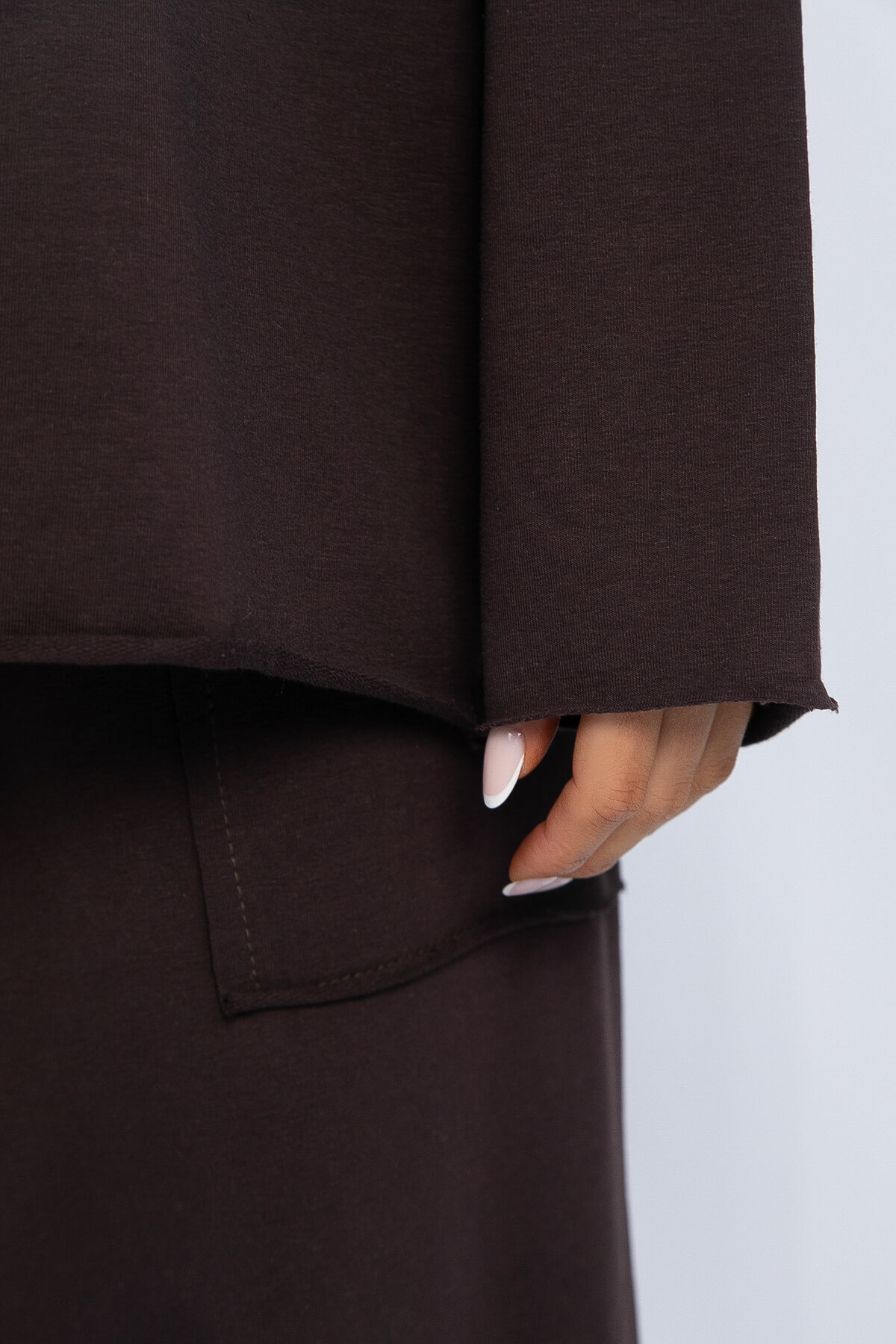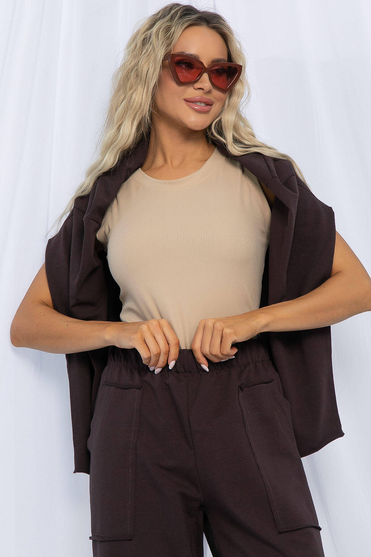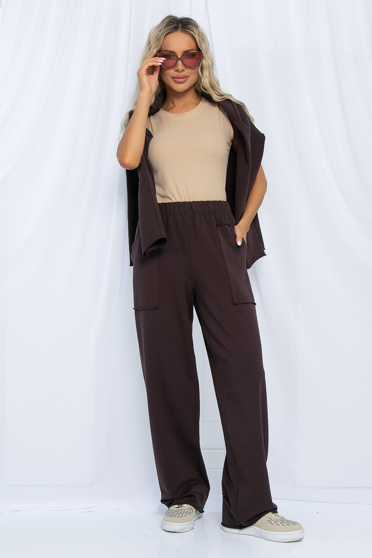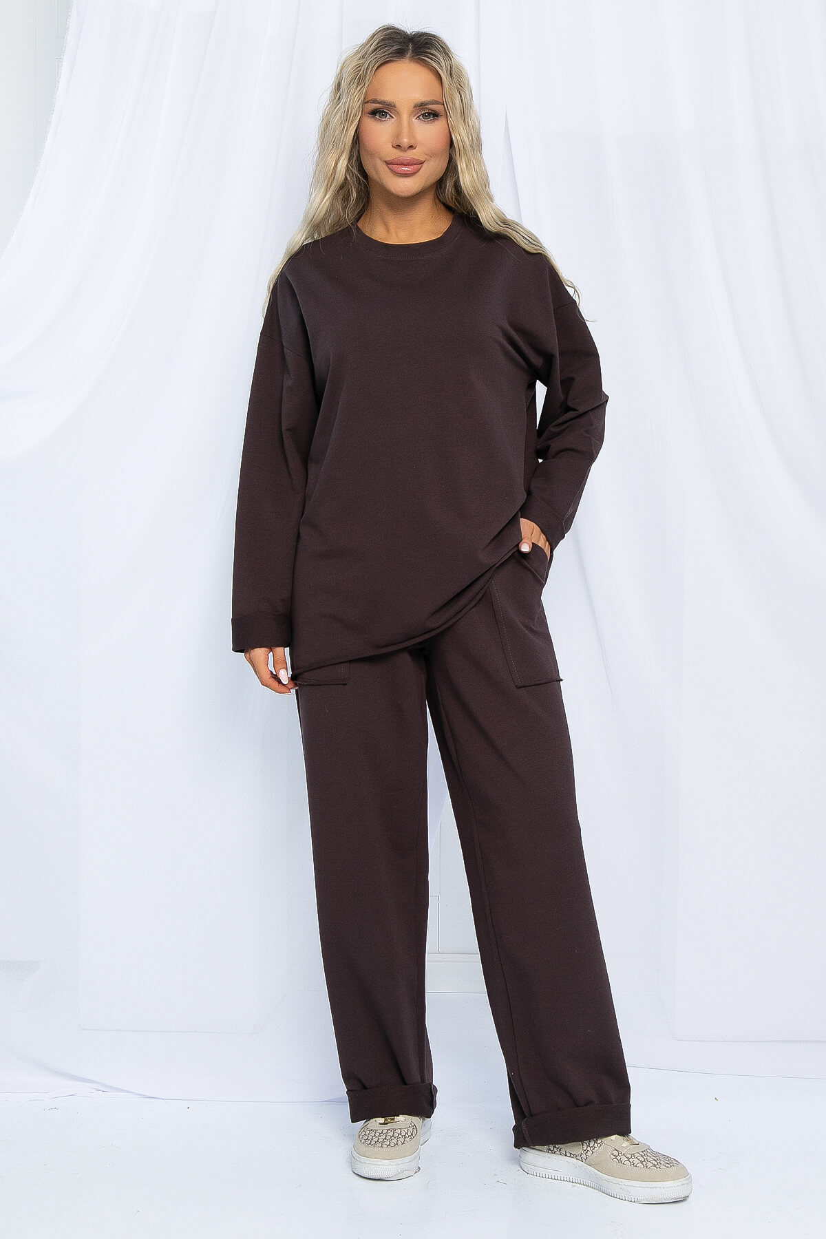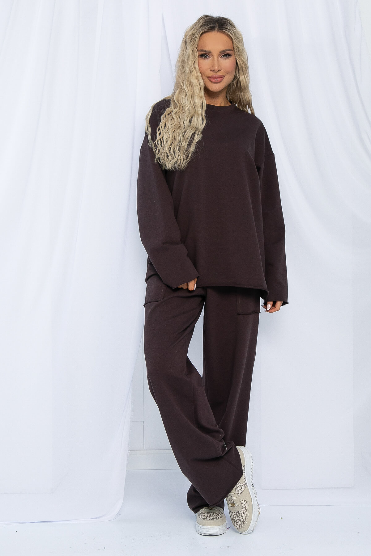 Современный городской стиль в базовом исполнении костюма! Крой oversize, необработанный край и накладные карманы выделяют костюм из десятка похожих! Обратите внимание на натуральный состав! Ткань хлопок 95%, комфортная и приятная в любой сезон и погоду. Костюм можно разделить на верх и низ и сочетать с любыми другими изделиями из вашего гардероба! Мы выбрали самый трендовый цвет этого года — шоколад! Еще одно преимущество этого костюма, что подойдет для девушек абсолютно любого роста! Просто подверните рукав или низ брюк!