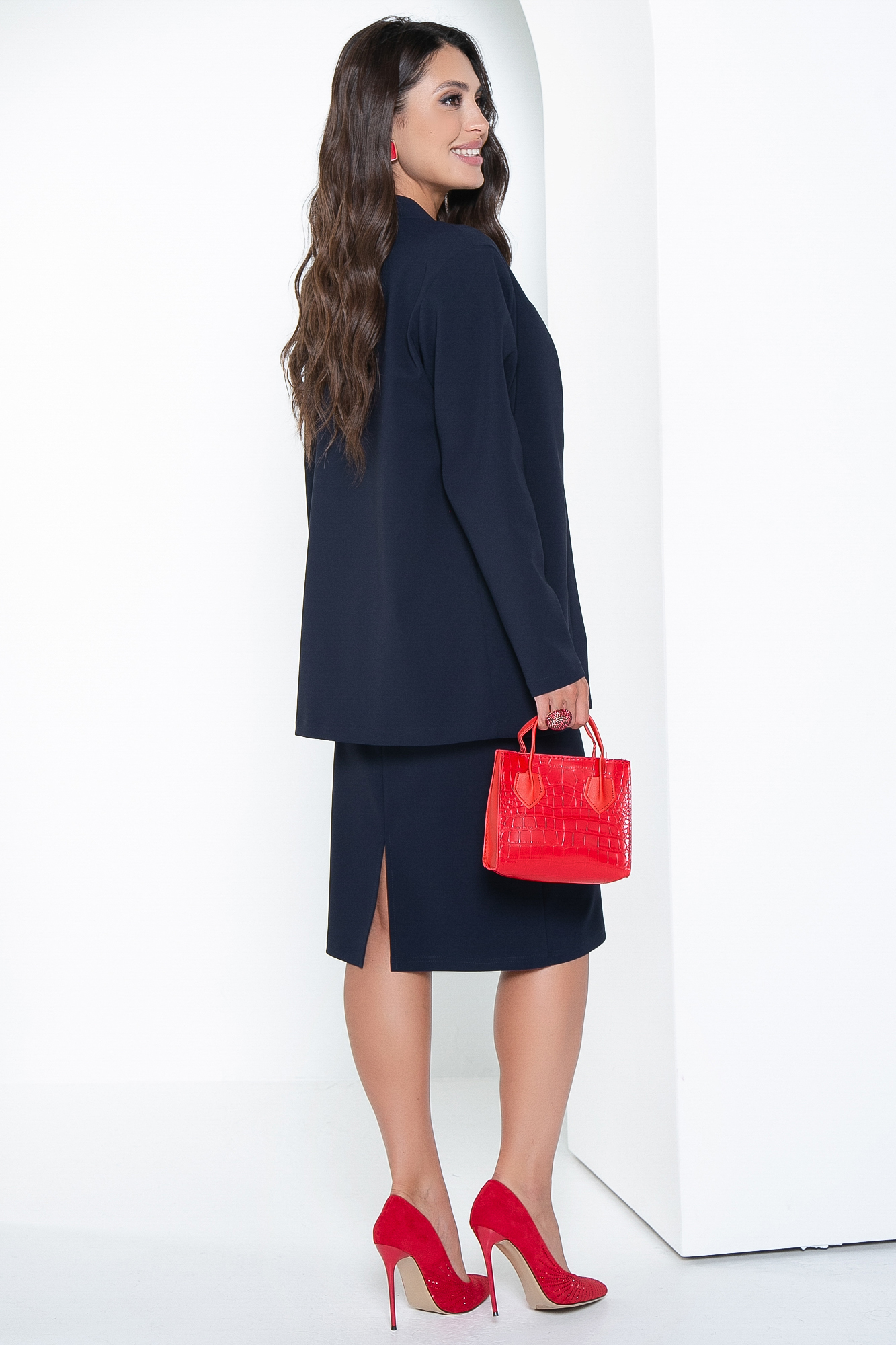 Женственный и изящный костюм с юбкой для современной леди. Стильные аксессуары, красивый макияж, причёска прибавят Вашему образу шарма и элегантности. Костюм универсален, легко комбинируется с другими вещами.