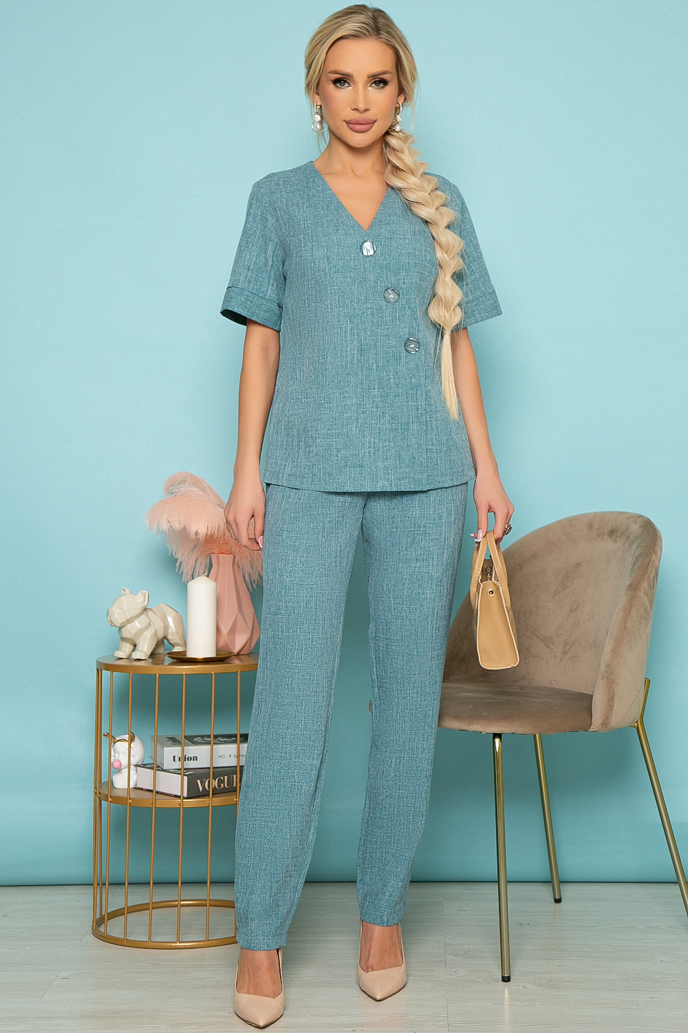 Брючный костюм - идеальная пара в офисном стиле. Блуза свободного кроя по переду украшена декоративными пуговицами в тон. Рукав втачной, короткий. Брюки прямого кроя, талия на резинке.