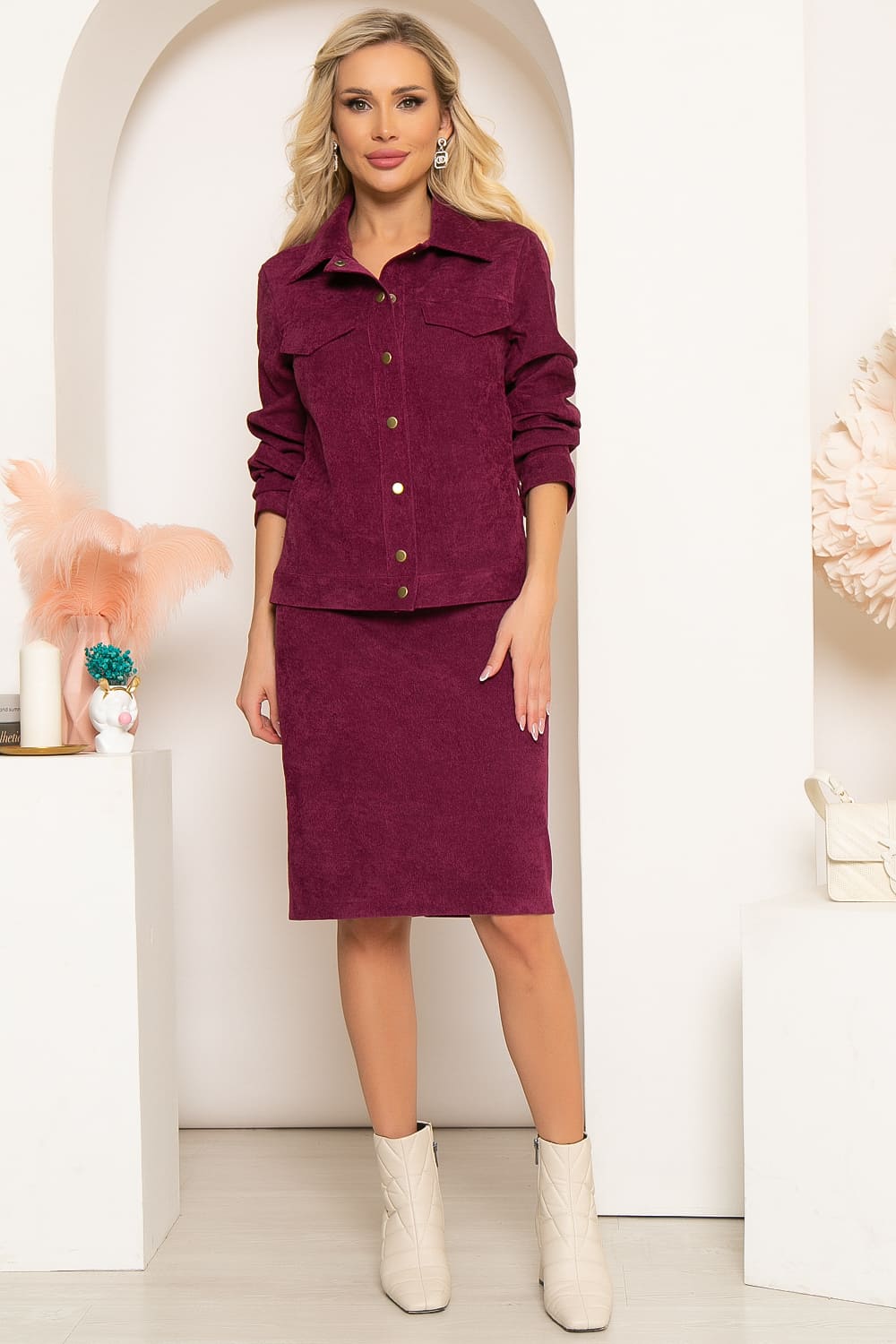 Костюм из микровельвета в оттенке "слива" - базовый комплект с изюминкой. Роскошно будет смотреться, как в монохромном образе, так и с яркими акцентами. Костюм состоит из юбки прямого кроя и жакета. Юбка на притачном поясе, с резинкой, по спинке застёгивается на потайную молнию. Сзади юбки разрез. Жакет по переду застёгивается на кнопки. Рукав длинный, втачной, на манжете. Манжеты также застёгиваются на кнопку. По груди имитация карманов с клапанами. Жакет выполнен на притачном поясе.