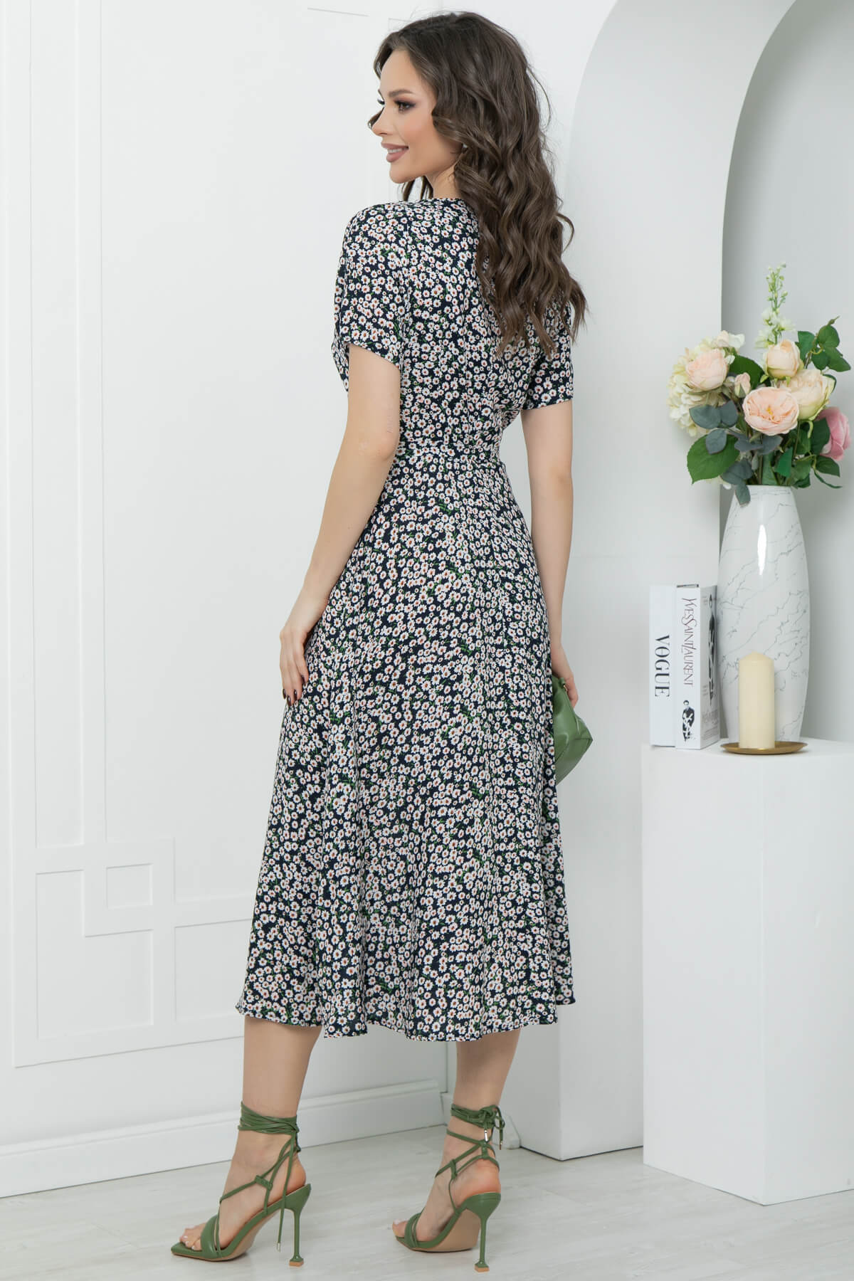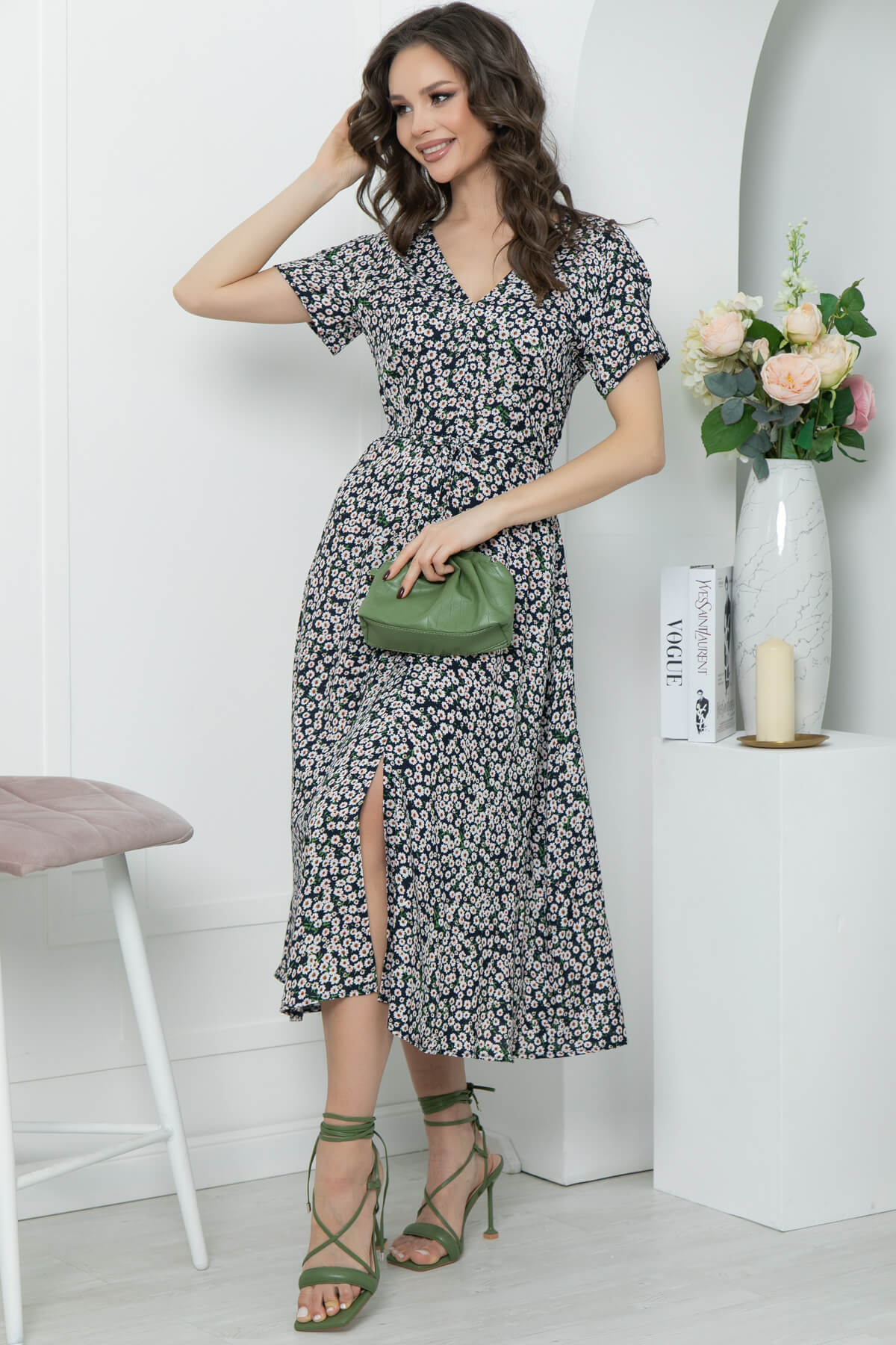 Элегантное платье, которое прекрасно подойдет для прогулки или свидания! Хорошо сочетается с каблучком и с обувью на низком ходу. Хит сезона - платье длины миди из натуральной ткани, с очень популярным сейчас цветочным принтом. Мягкий V-образный вырез красиво подчёркивает шею, тонкий поясок - подчеркнет талию. Небольшой разрез по переду выразительно подчеркнет и удлинит Ваши ножки! В боковом шве потайная молния.