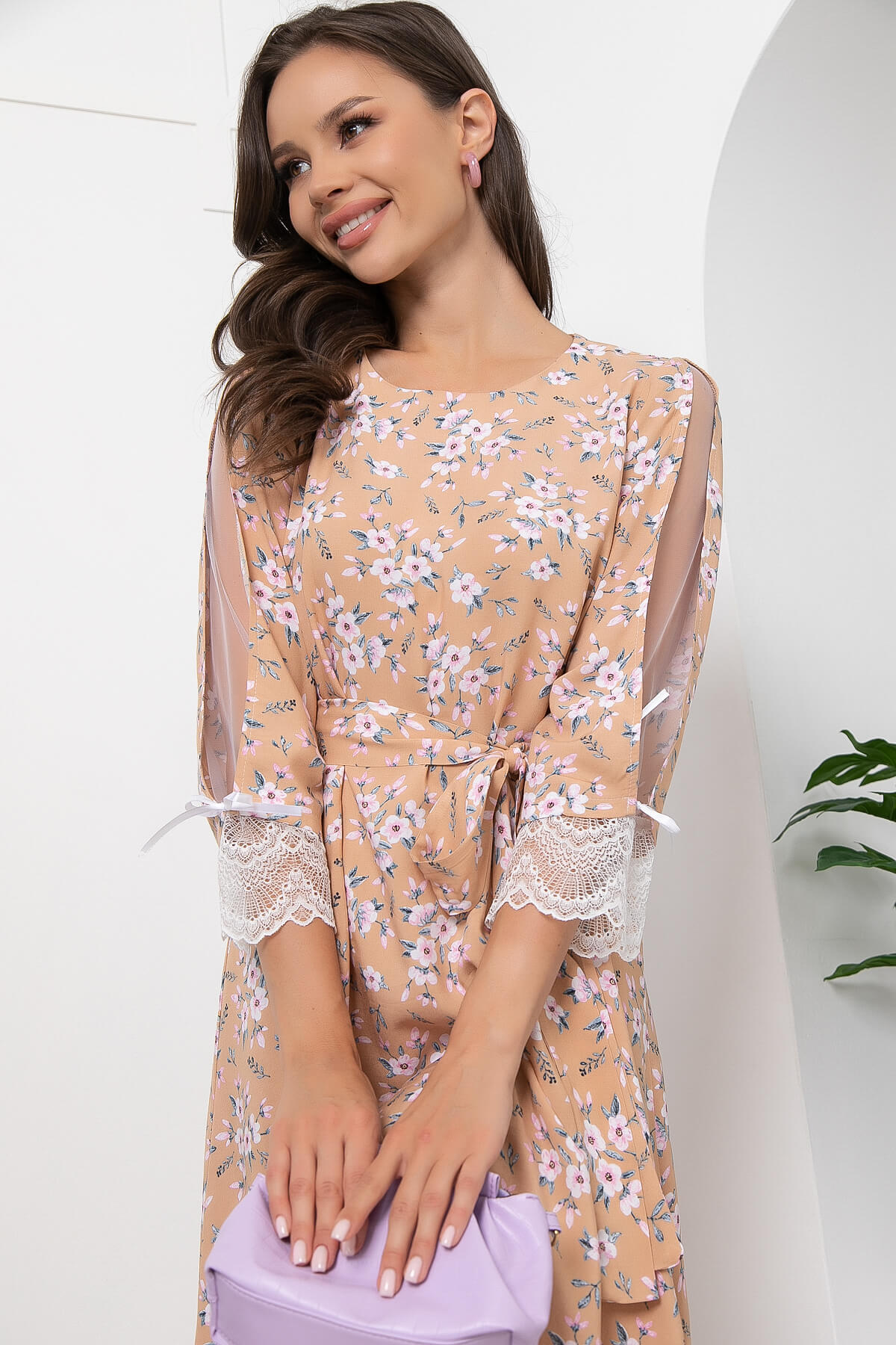 Платье, наполненное всеми атрибутами женственности. Лёгкое, струящееся платье подойдёт для любого типа фигуры за счет свободного кроя. При помощи пояса, входящего в комплект, можно подчеркнуть линию талии. Вырез горловины - округлый. Рукав втачной, три четверти, украшен сеткой с кружевом по нижнему краю и атласными лентами.