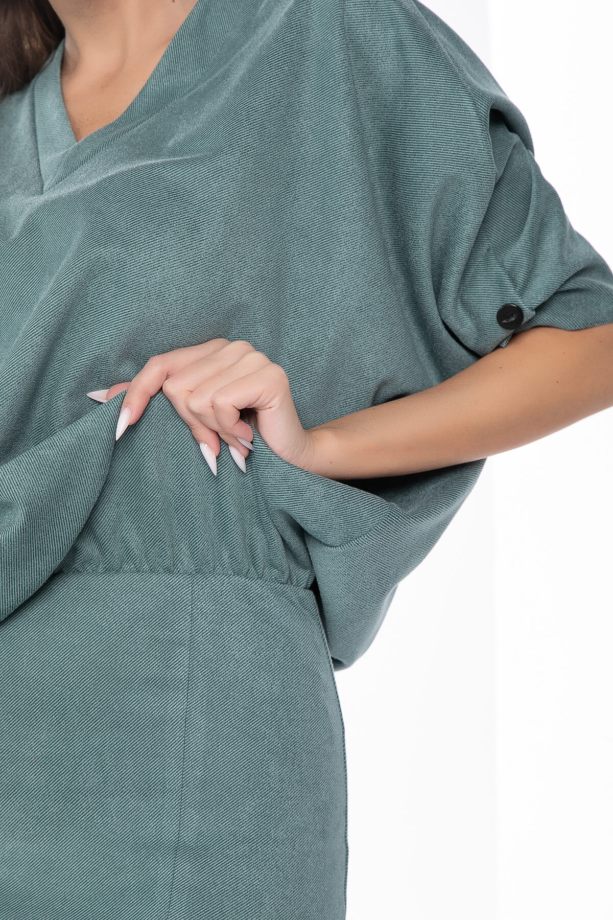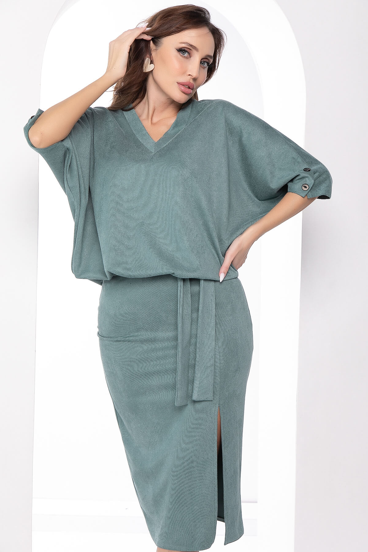 Платье из трикотажа в модном оттенке. Элегантная юбка с игривым разрезом визуально удлиняет ножки. Свободный крой платья скрывает недостатки фигуры. Рукав скроен по типу "летучая мышь", декорирован пуговицами. По талии отрезное. Идеальное решение на каждый день и на праздничное мероприятие.