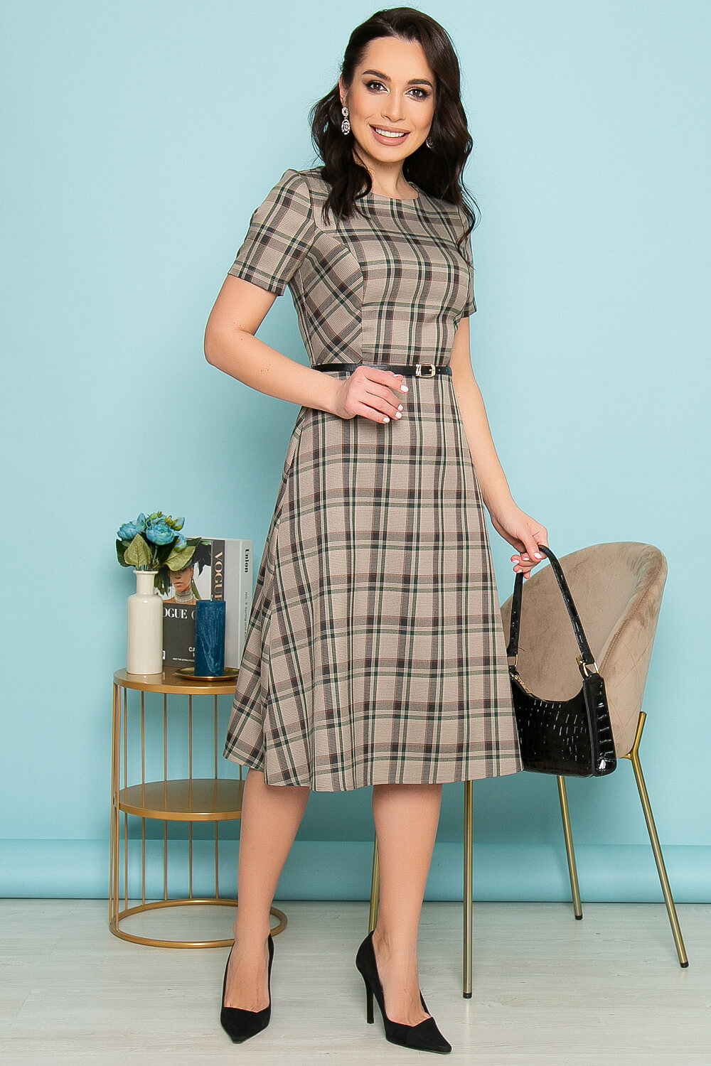 Платье в клетку, говорящее о тонком чувстве вкуса его обладательницы. Элегантный силуэт, качественные материалы, практичность - характеристики идеального платья в английском стиле. Платье приталенного силуэта средней длины. Юбка А-силуэта, втачной короткий рукав. В комплект входит кожаный поясок. Мягкий округлый вырез горловины. По спинке потайная молния.