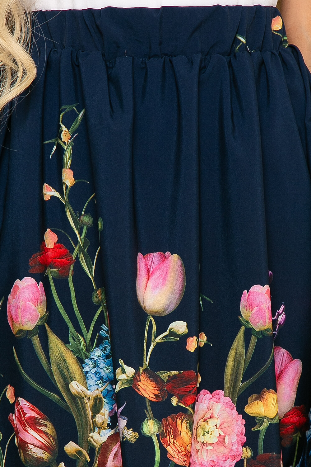 Юбка-полусолнце на резинке создана для романтичных натур. Она прекрасно подойдёт, как для повседневного, так и для создания нарядного образа. Юбка на резинке, по низу украшена цветочным принтом.