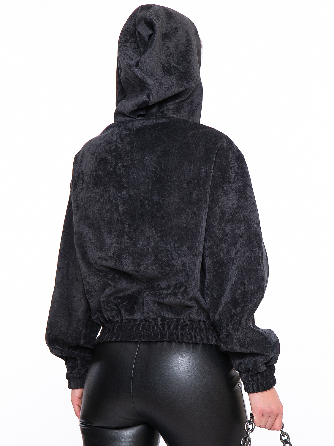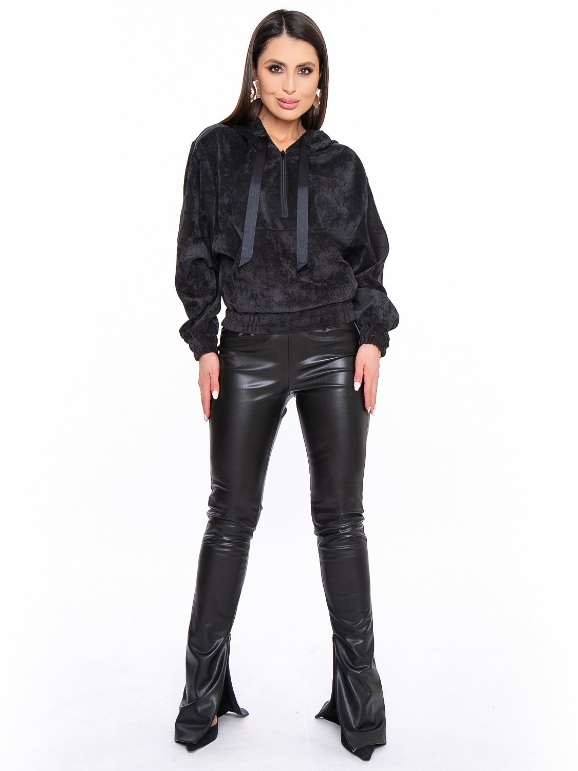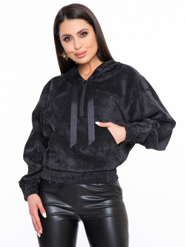 - Худи из вельвета свободного кроя с капюшоном и карманом кенгуру, по переду застежка-молния;